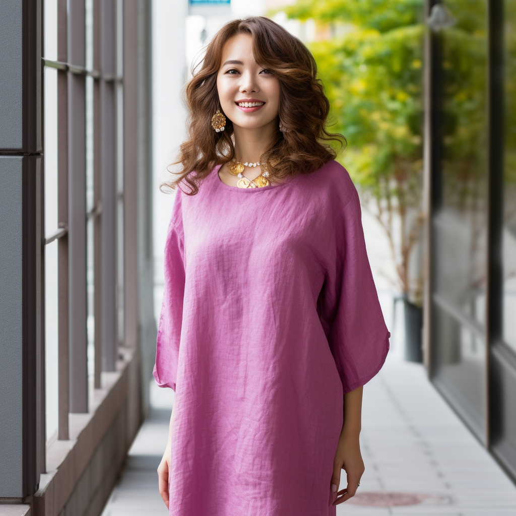 Hemp Linen Gradation Ancien Pink Side Tuck Tunic Dress French Sleeve AP14