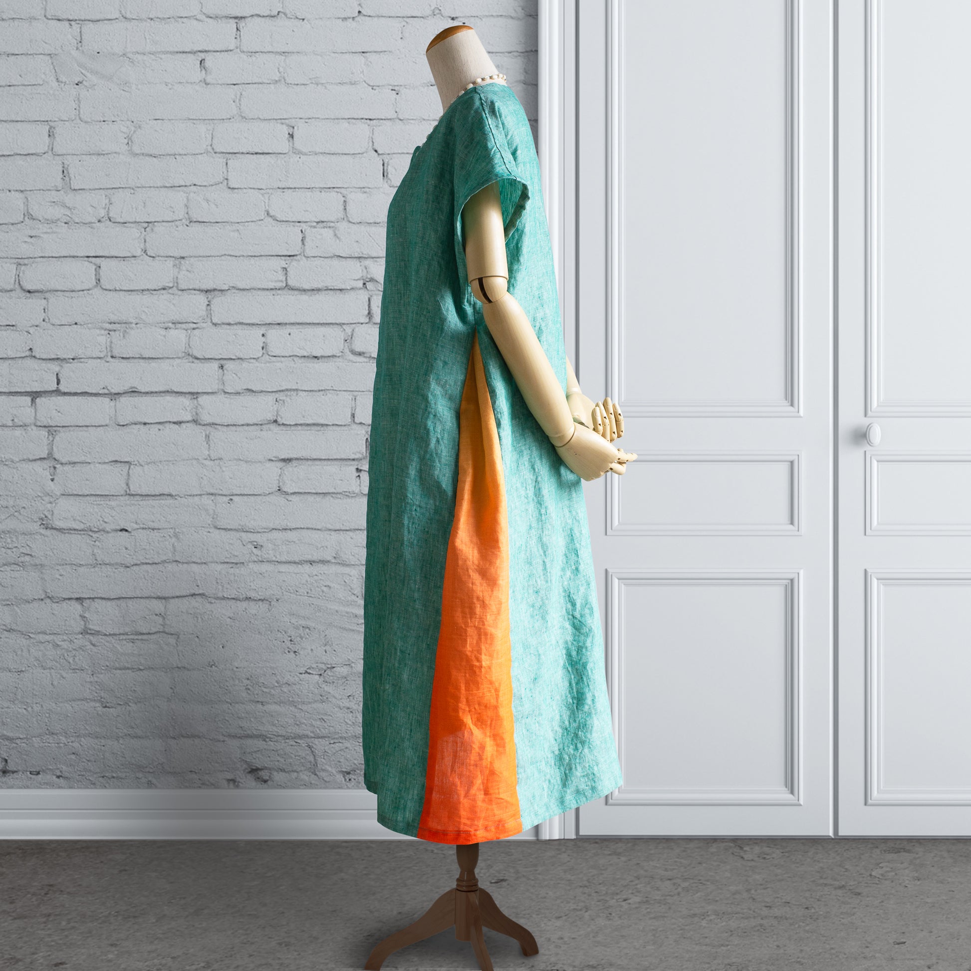 ★ Linen Jade Green with Gradation Sunset Side Tuck Dress (French Sleeve)