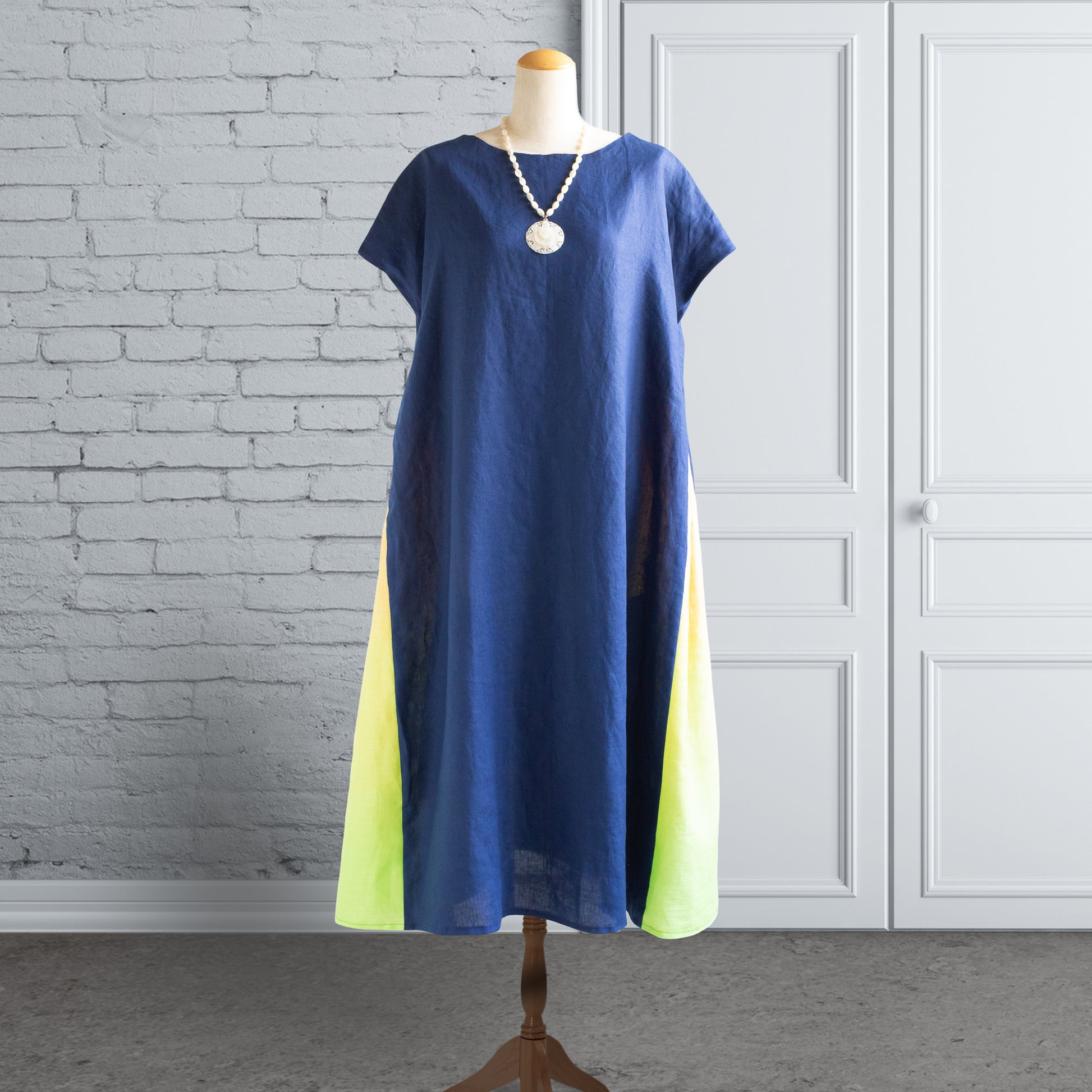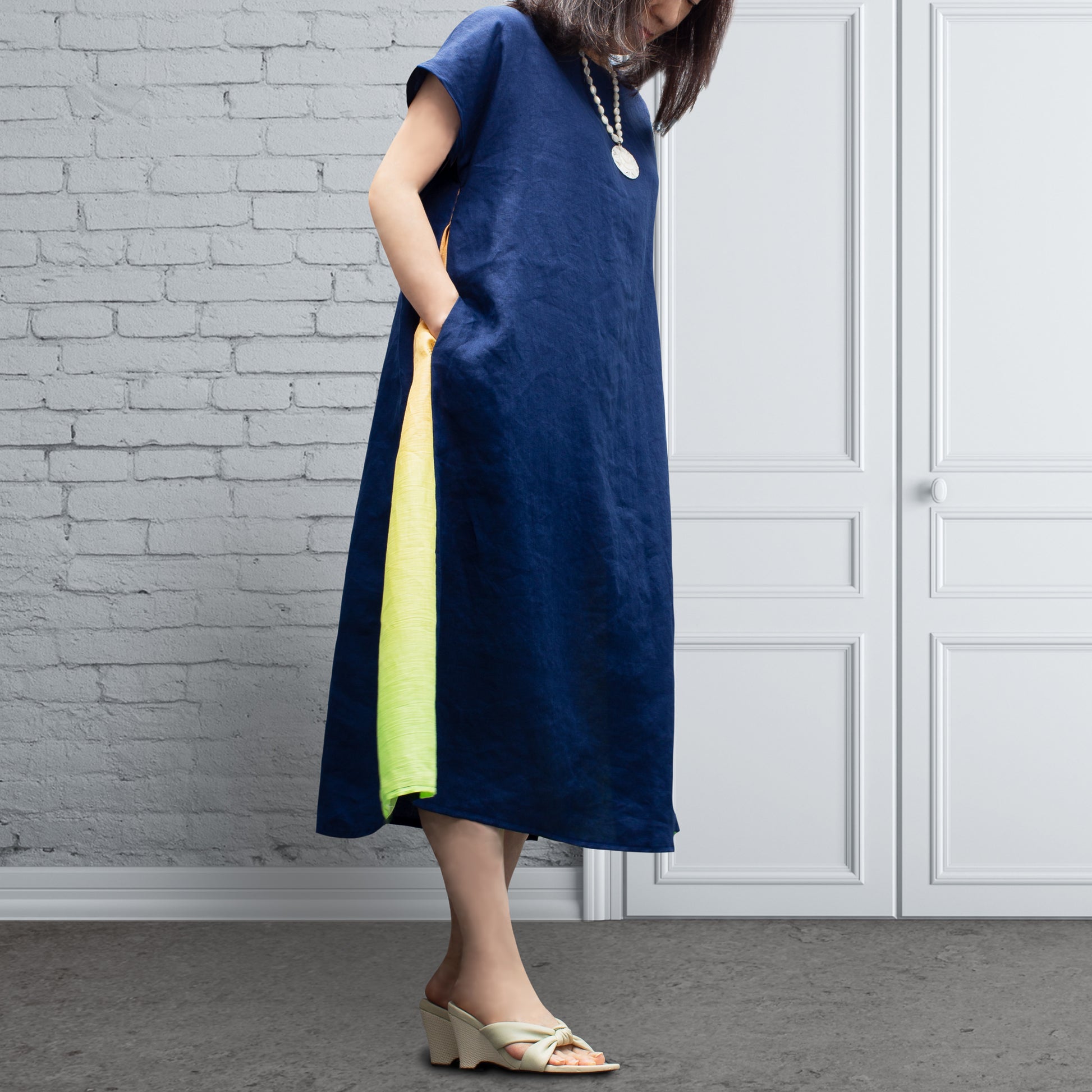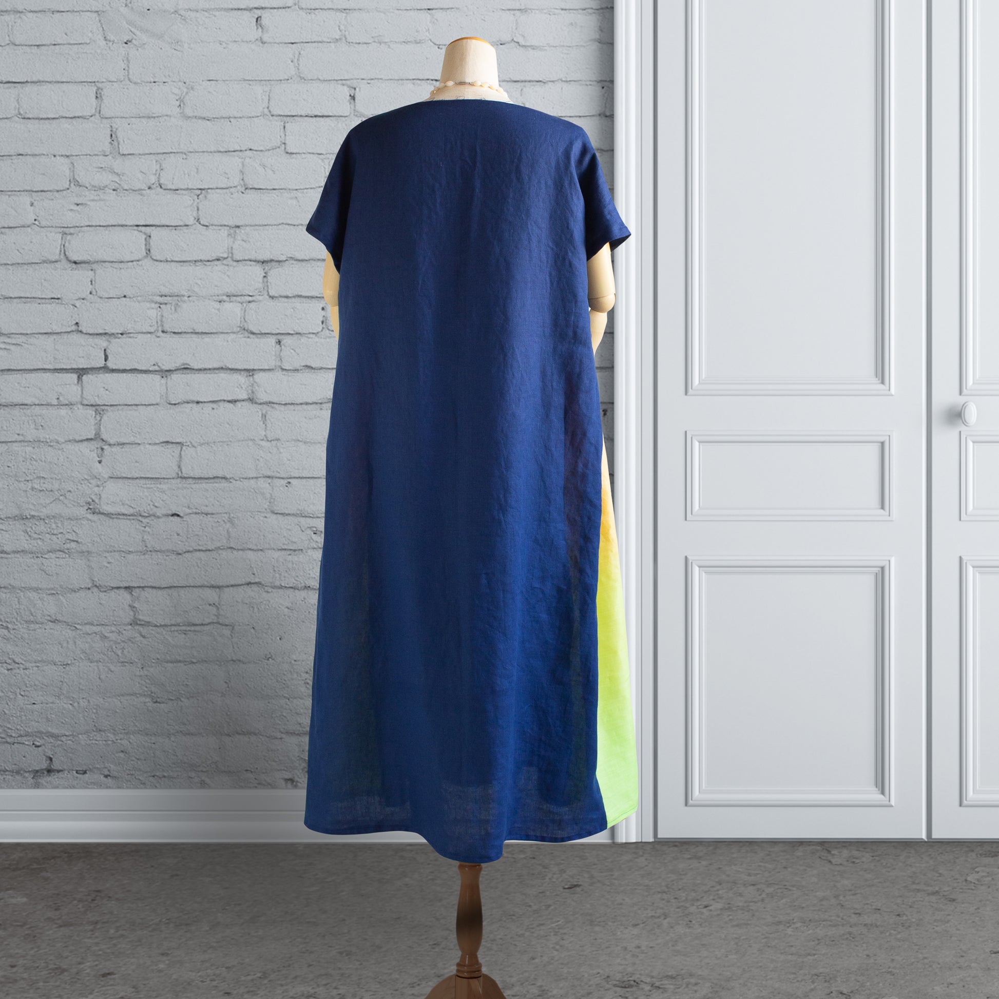 Signature 亞麻 深藍 × 鸚鵡色漸層 側褶連衣裙(法式袖)