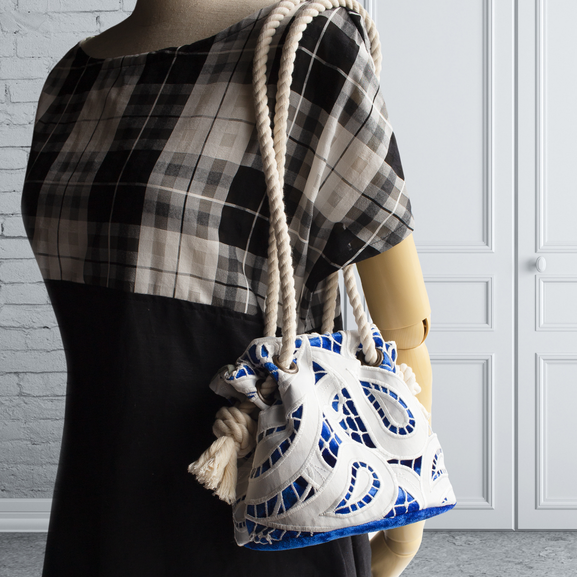 ★ Campanulle 白色蕾絲藍天鵝絨抽繩小包