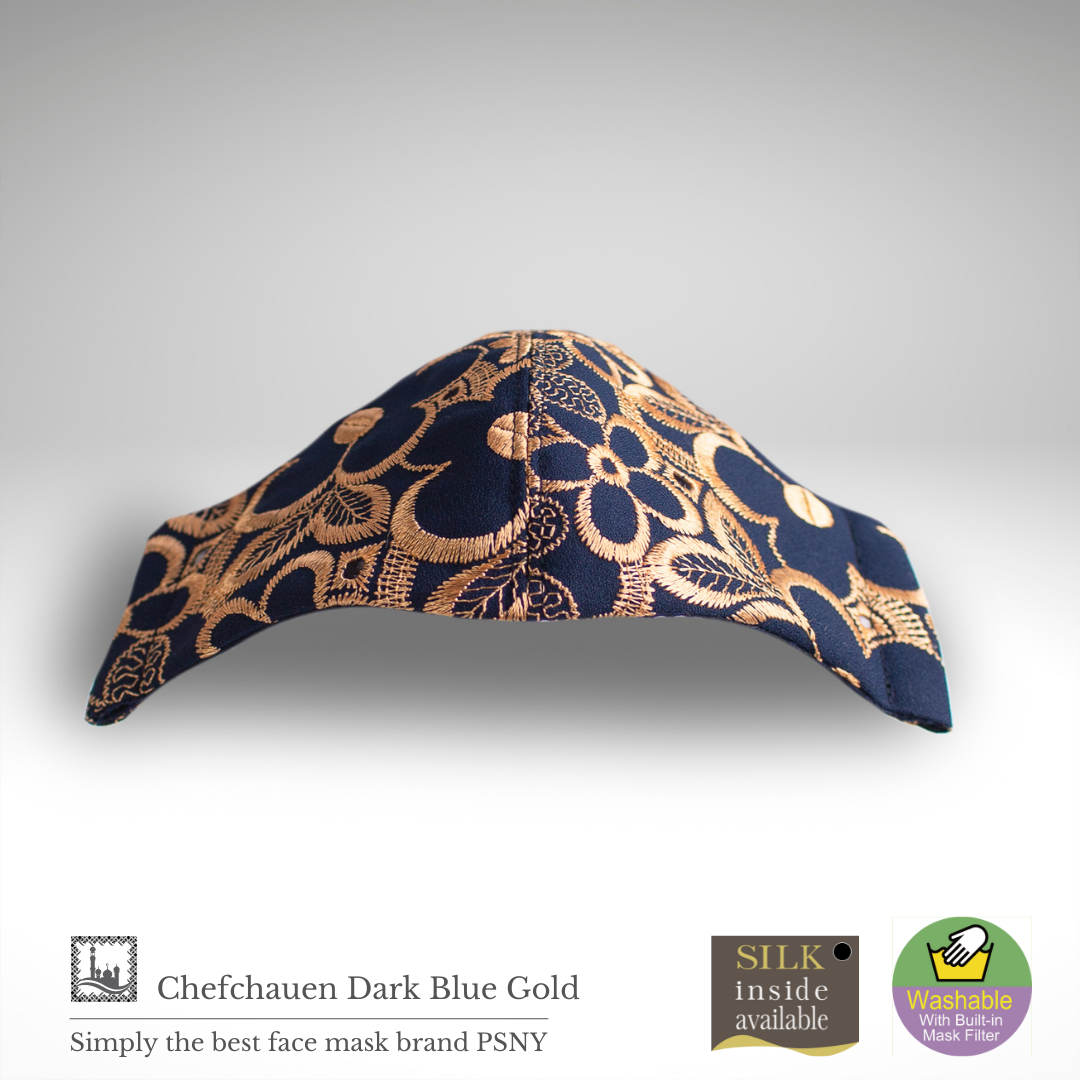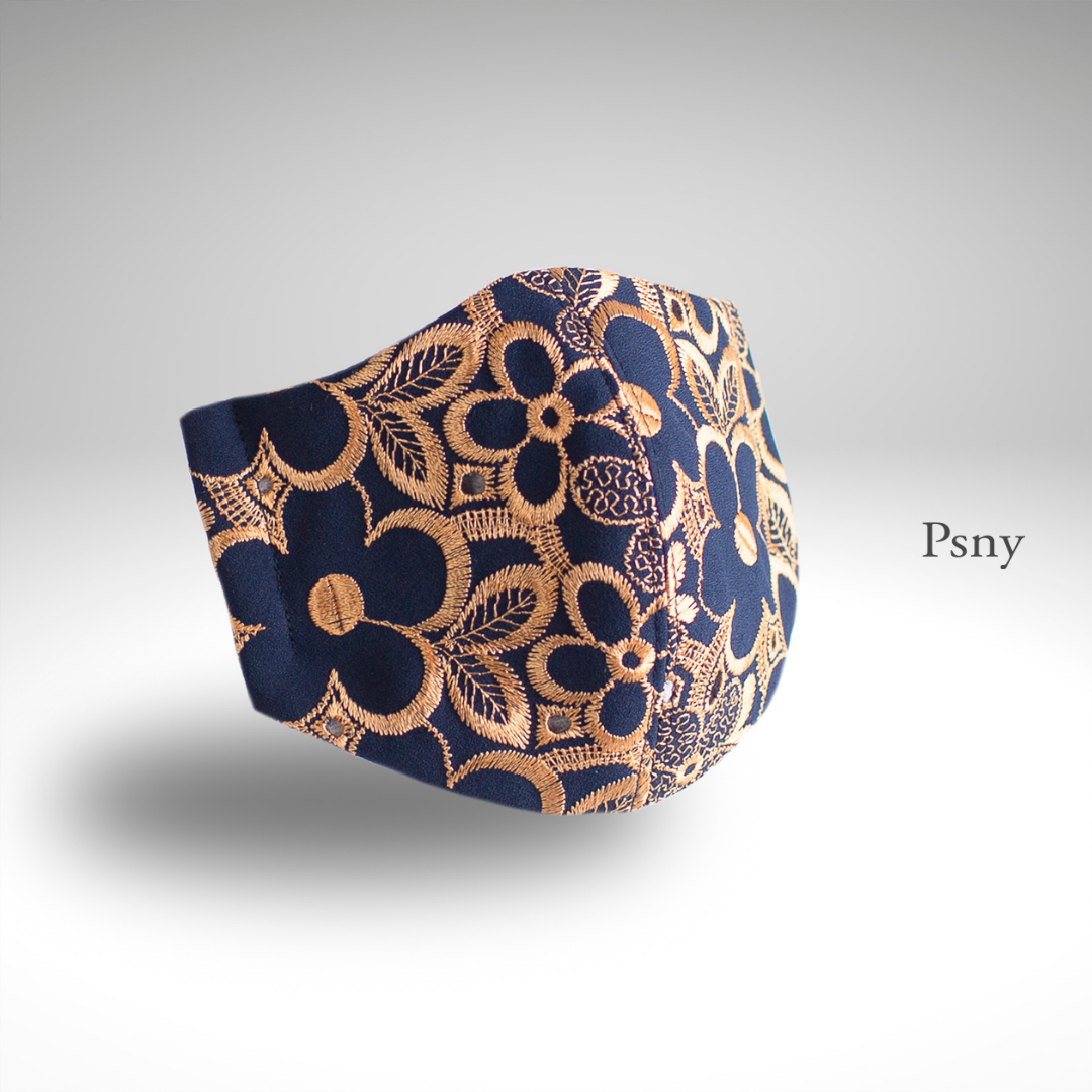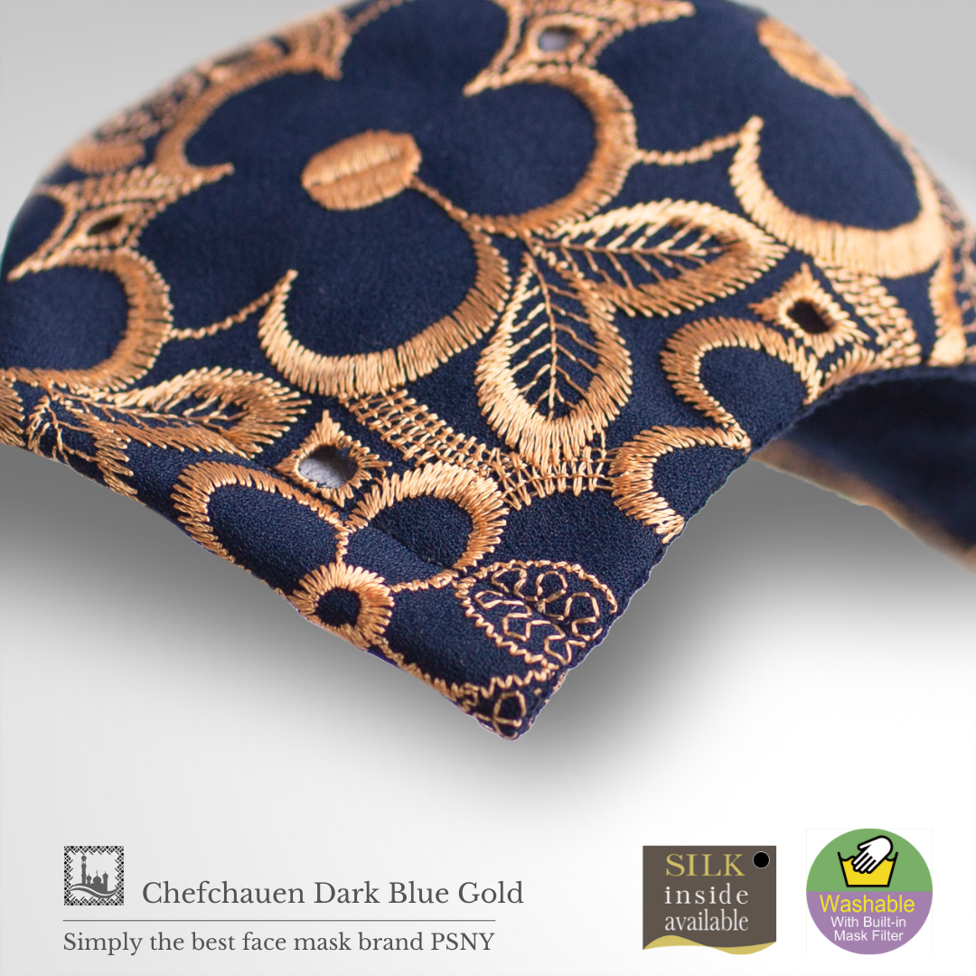 【Fabulous Chefchaouen 深藍金面具】Fabulous Chefchaouen 系列,精緻漂亮的刺繡蕾絲。一款奢華的面具,在優雅的深藍色底座上飾有華麗的棕色和金色刺繡。是好萊塢名流最愛的PSNY品牌獨有的完美度極高的作品。 (數量有限)