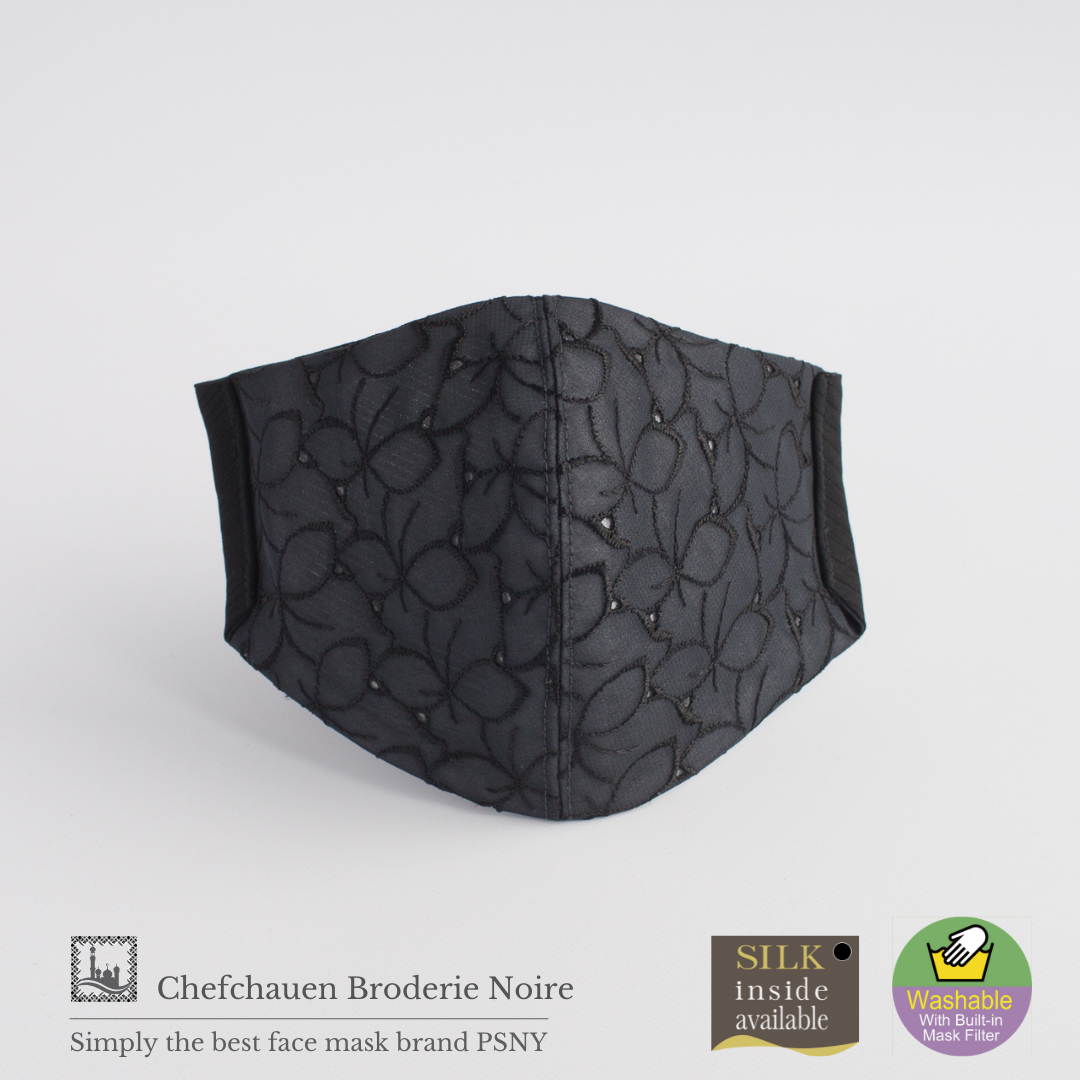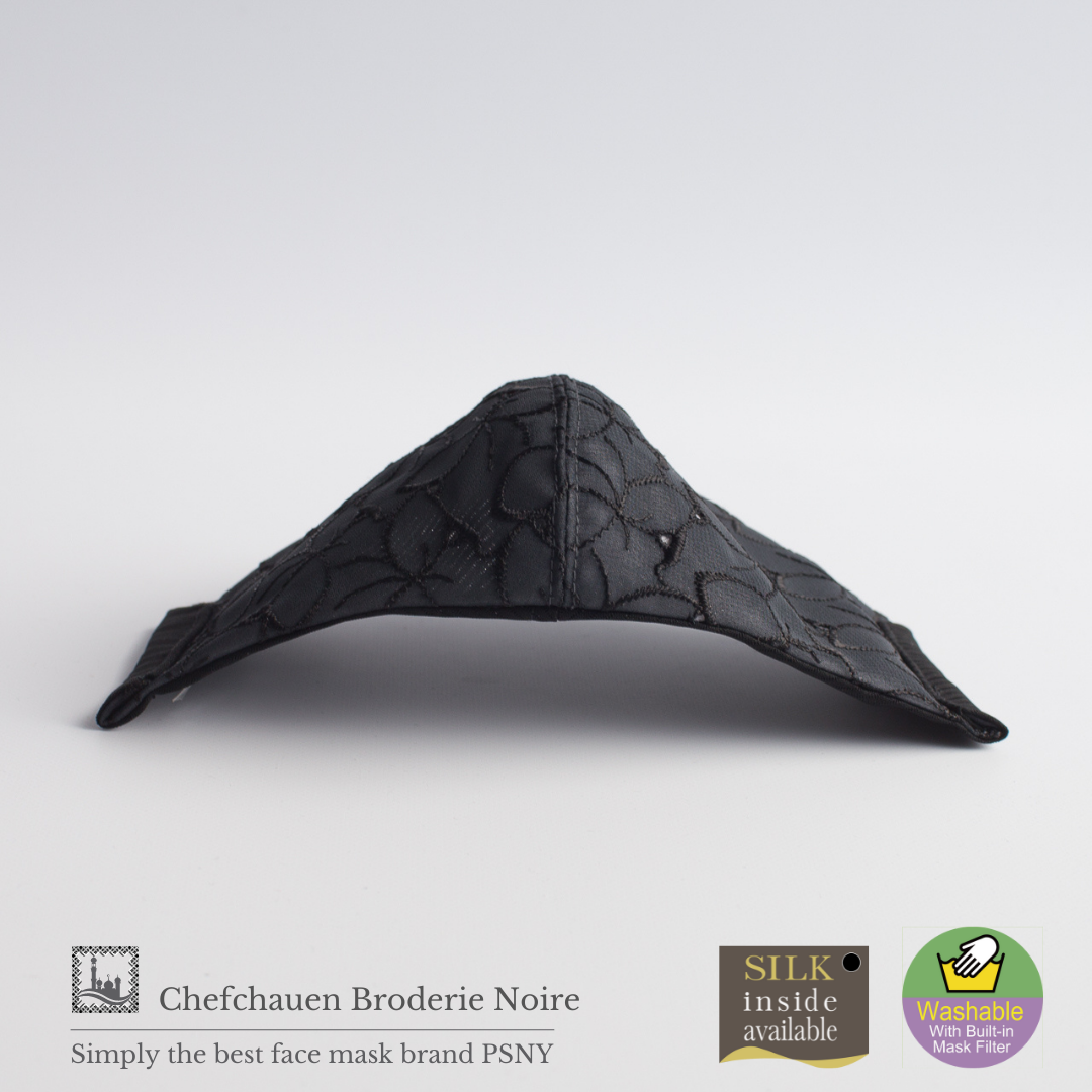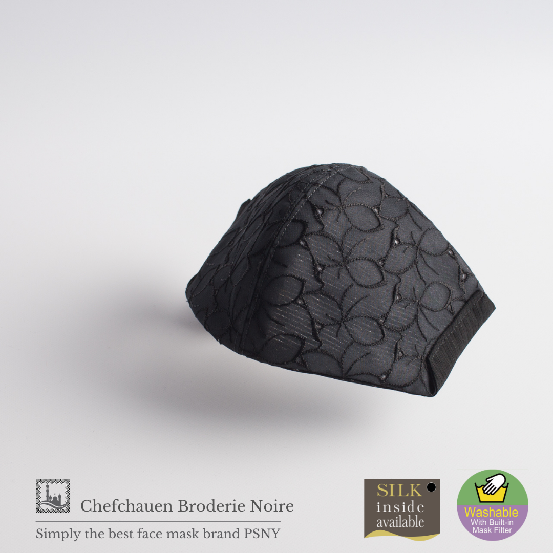 Fabulous Chefchaouen系列刺繡花邊精緻漂亮。將傳統的東方蕾絲黑色刺繡與透明底座相結合,給人以優雅印象的面具。內層夏絲設計在正面,讓正面的花邊不接觸皮膚。
