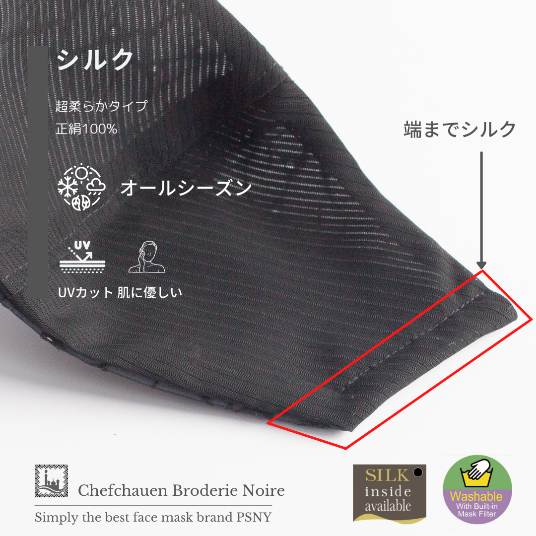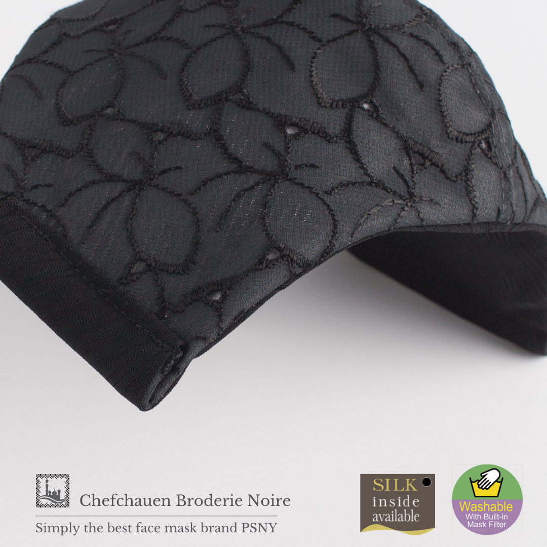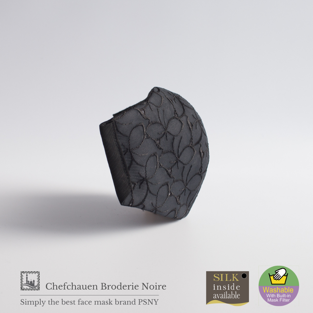 Fabulous Chefchaouen系列刺繡花邊精緻漂亮。將傳統的東方蕾絲黑色刺繡與透明底座相結合,給人以優雅印象的面具。內層夏絲設計在正面,讓正面的花邊不接觸皮膚。