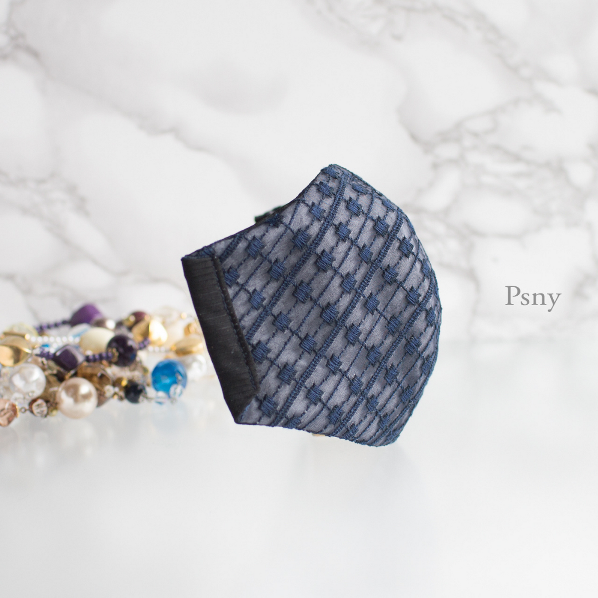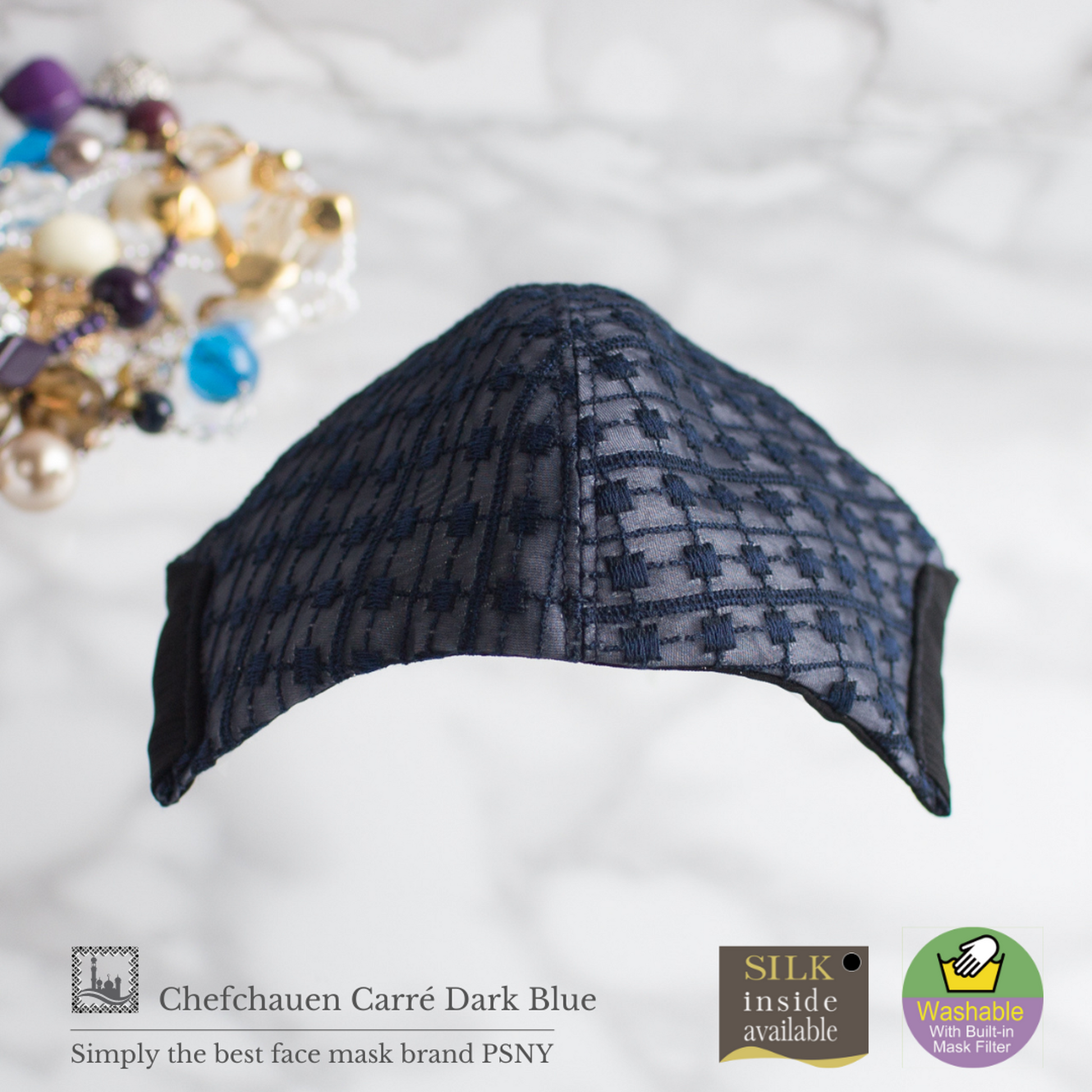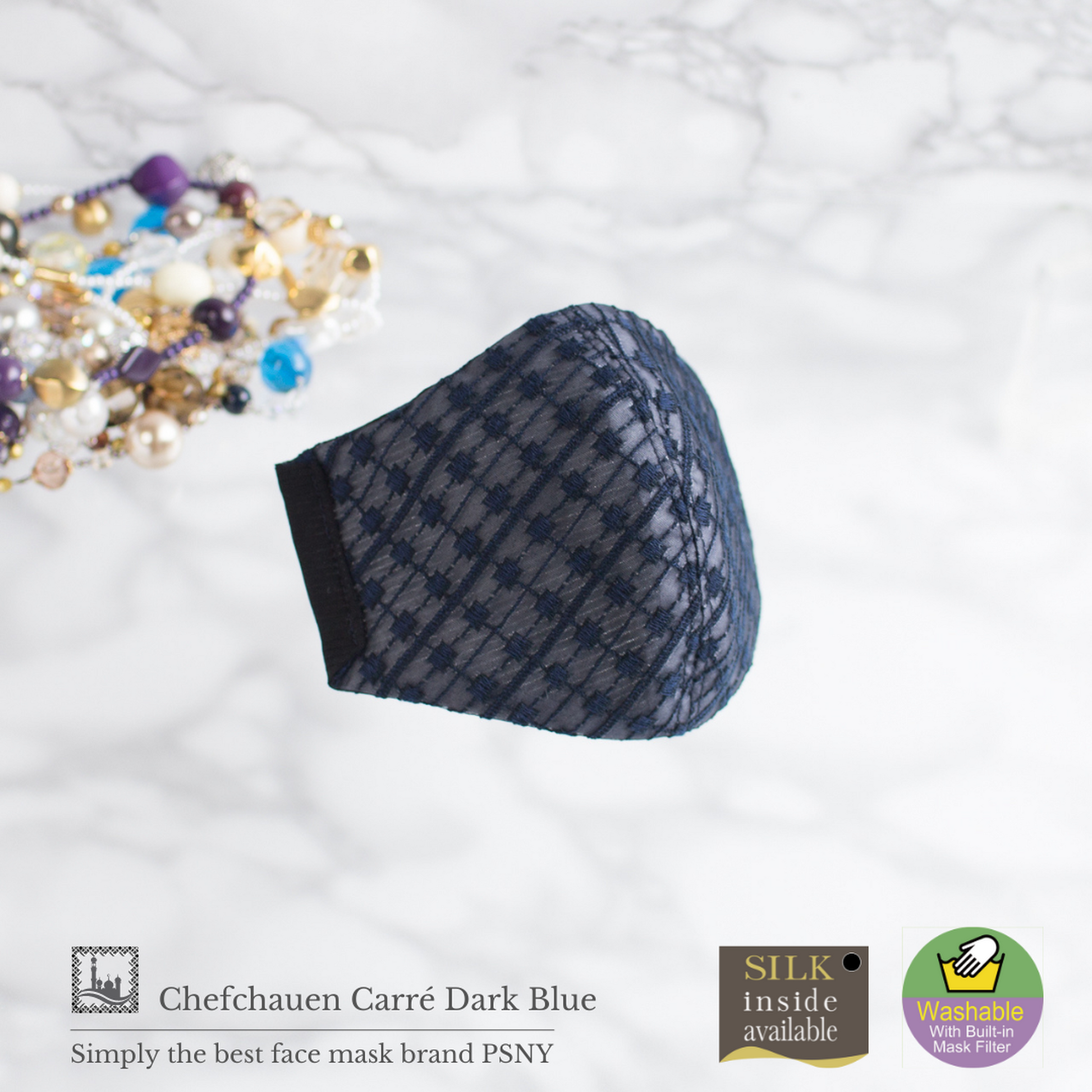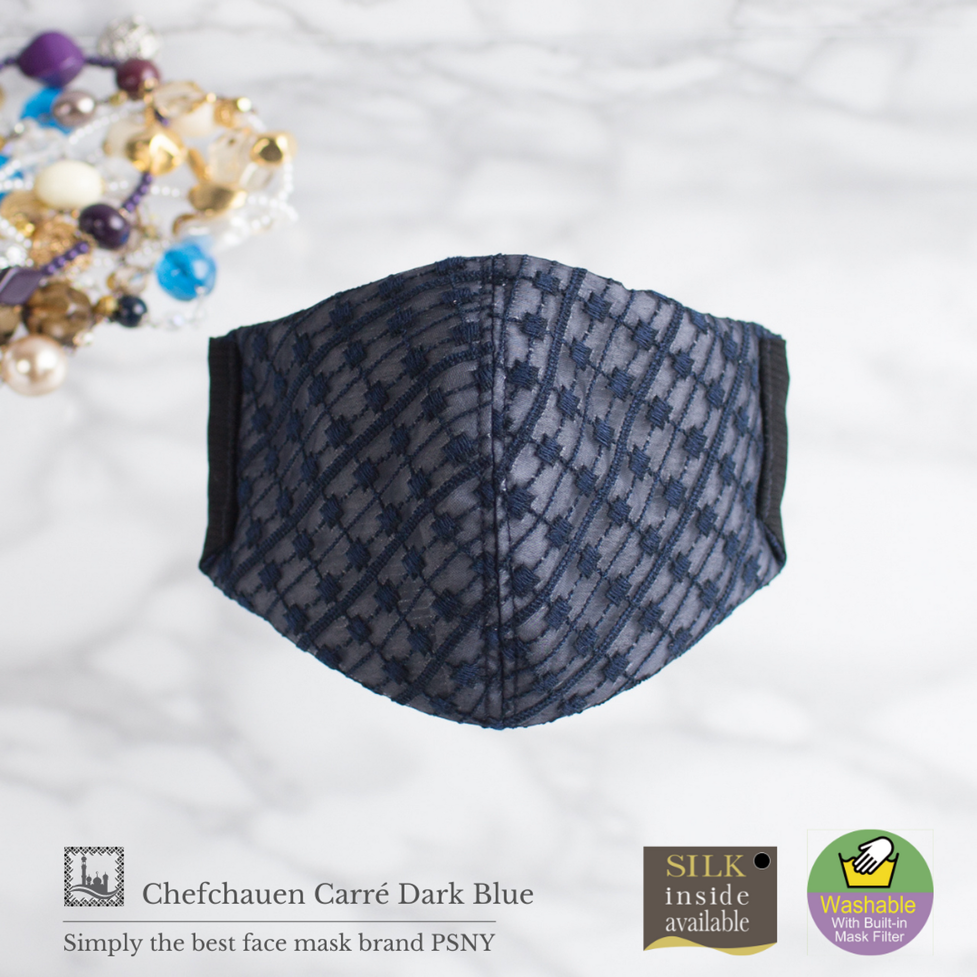 【Fabulous Chefchaouen Carr?深藍】Fabulous Chefchaouen系列,精緻漂亮的刺繡蕾絲。獨特的carre設計和蕾絲的深藍色刺繡與透明底座相結合,打造出給人以優雅印象的面具。內層夏絲設計在正面,讓正面的花邊不接觸皮膚。是好萊塢名流最愛的PSNY品牌獨有的完美度極高的作品。 (數量有限)配有安全可清洗的過濾器,因此您可以反複使用。