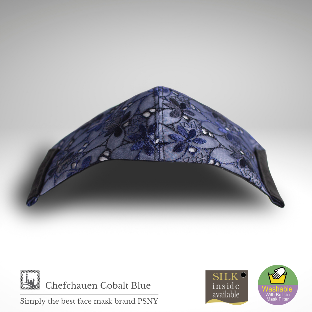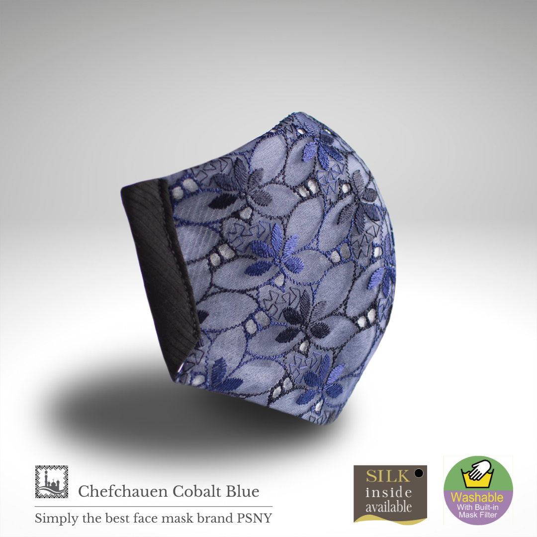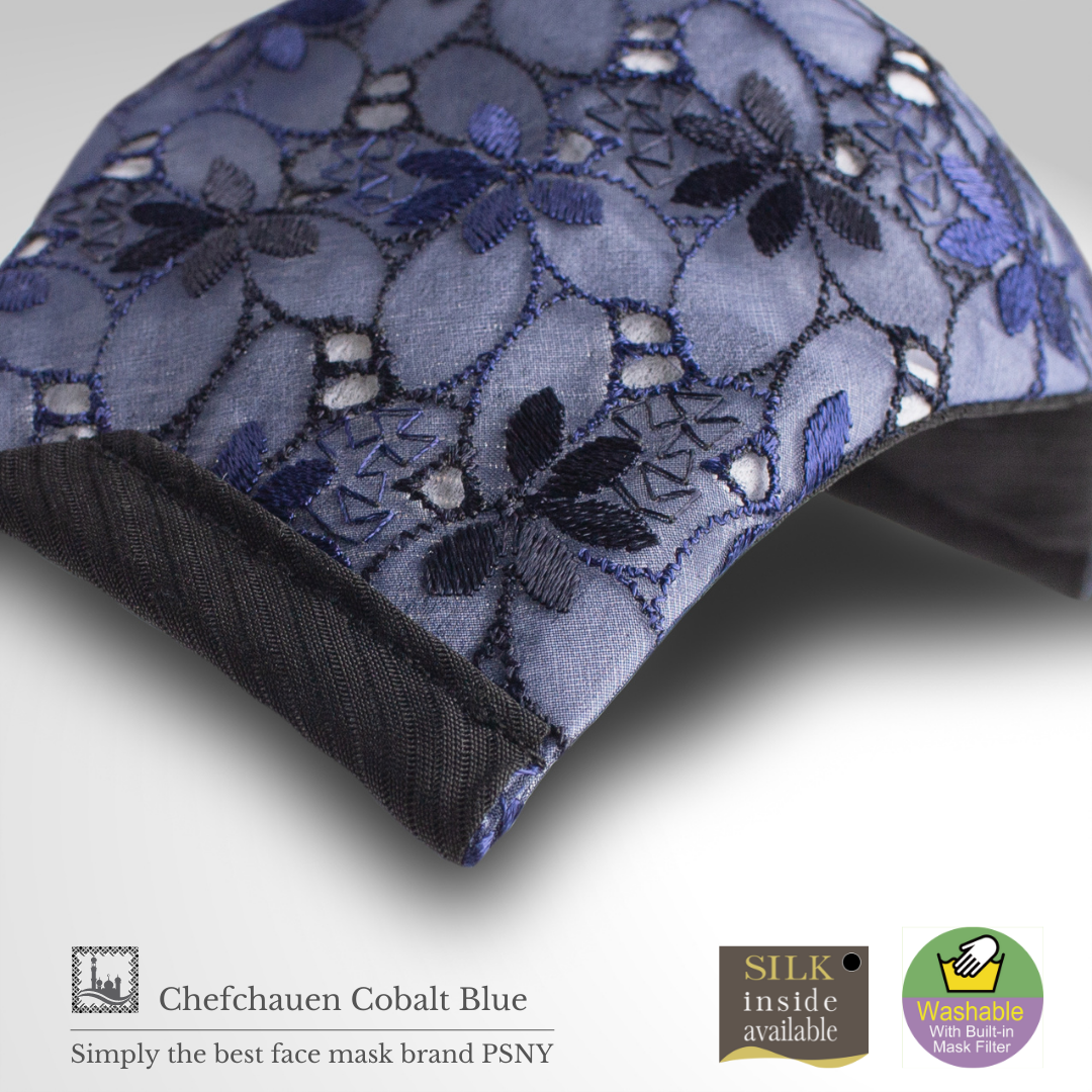 Fabulous Chefchaouen系列刺繡花邊精緻漂亮。鈷藍色多層蕾絲是一款給人以優雅印象的奢華面具。內層夏絲設計在正面,讓正面的花邊不接觸皮膚。