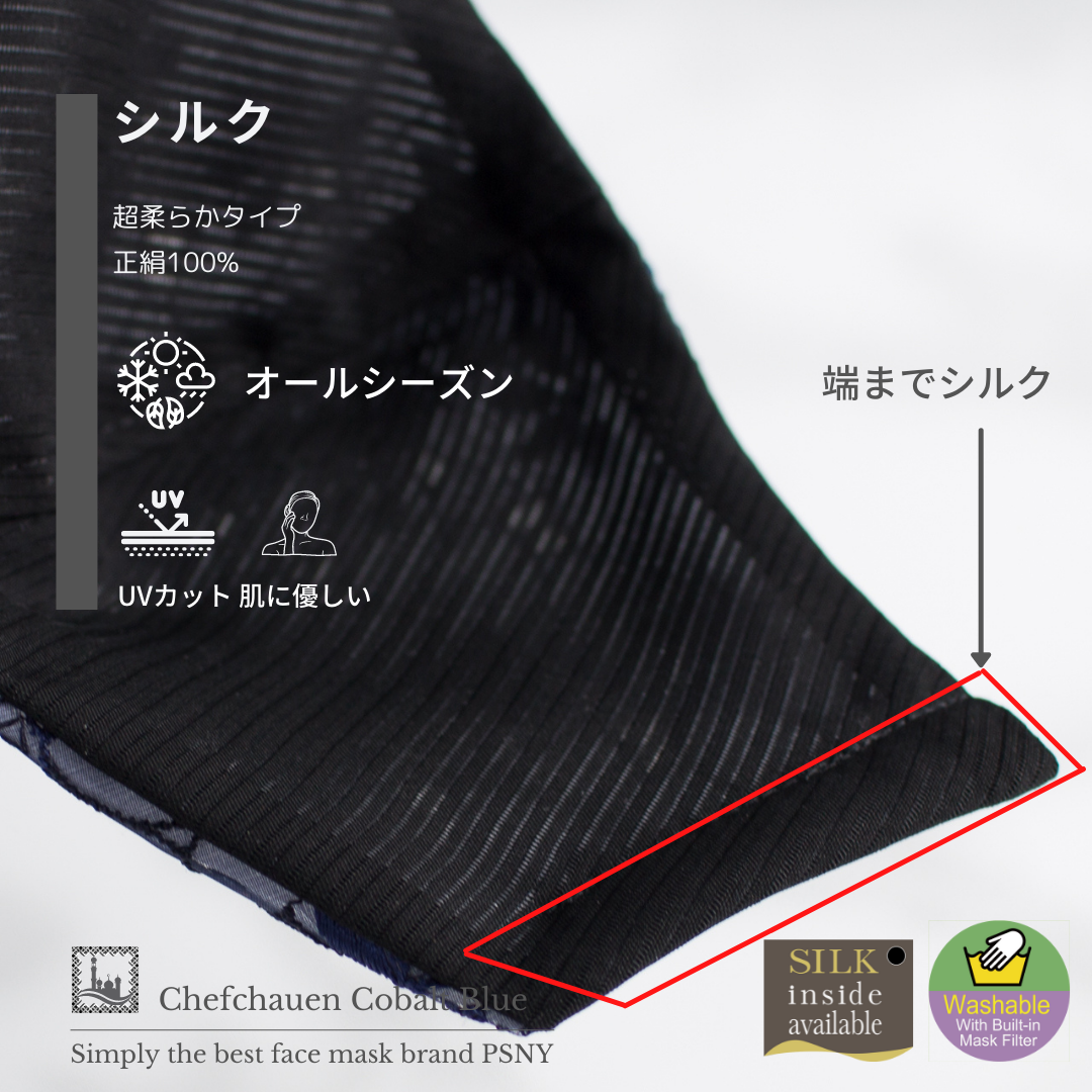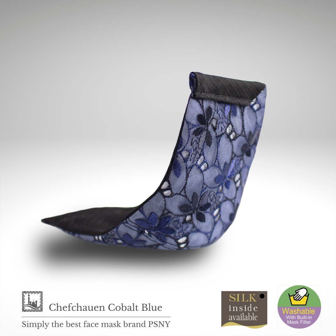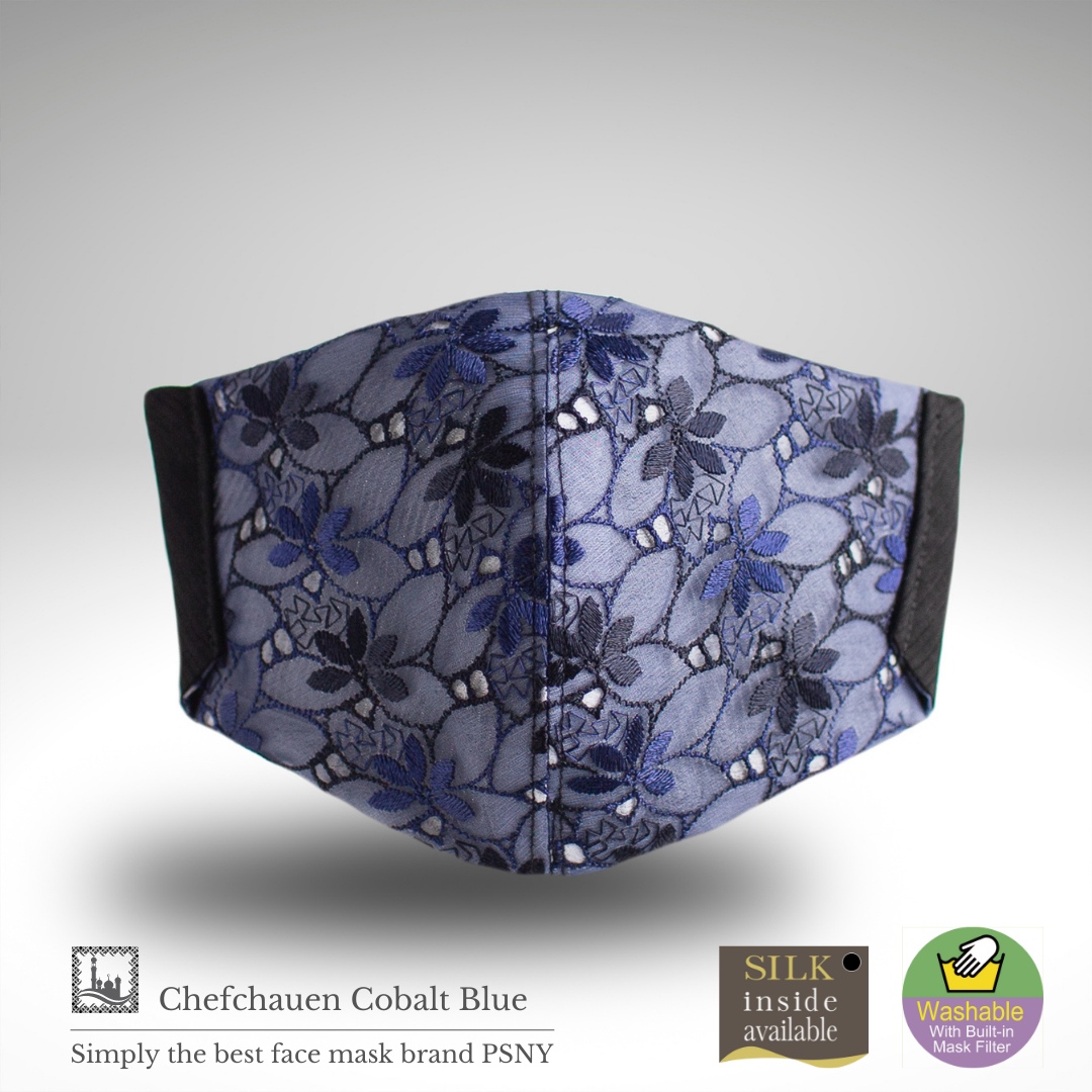 Fabulous Chefchaouen系列刺繡花邊精緻漂亮。鈷藍色多層蕾絲是一款給人以優雅印象的奢華面具。內層夏絲設計在正面,讓正面的花邊不接觸皮膚。