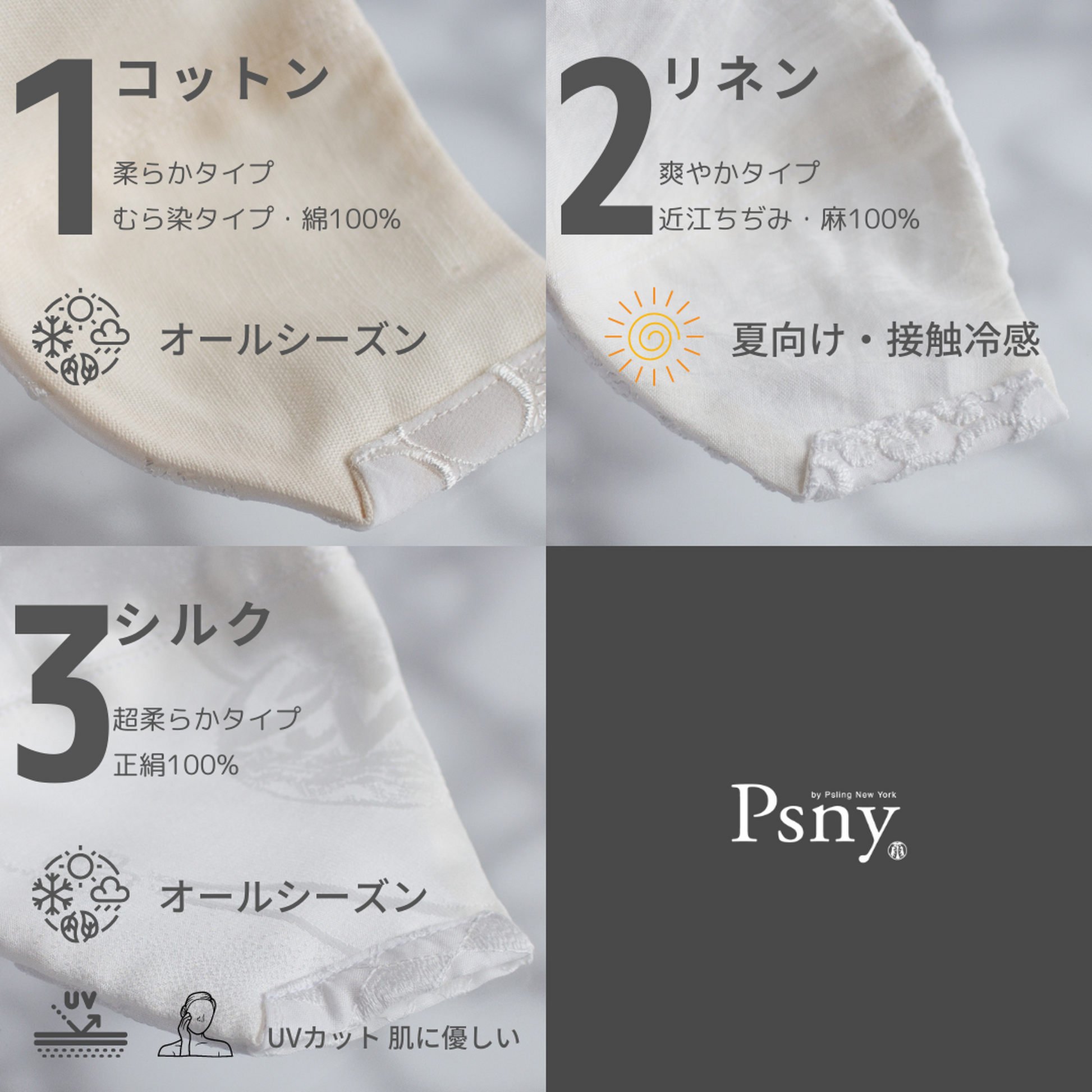 1 號顏色:棉(米白色):柔軟型 2 號顏色:亞麻(白色):清爽型 3 號顏色:絲綢(白色):超柔軟型
