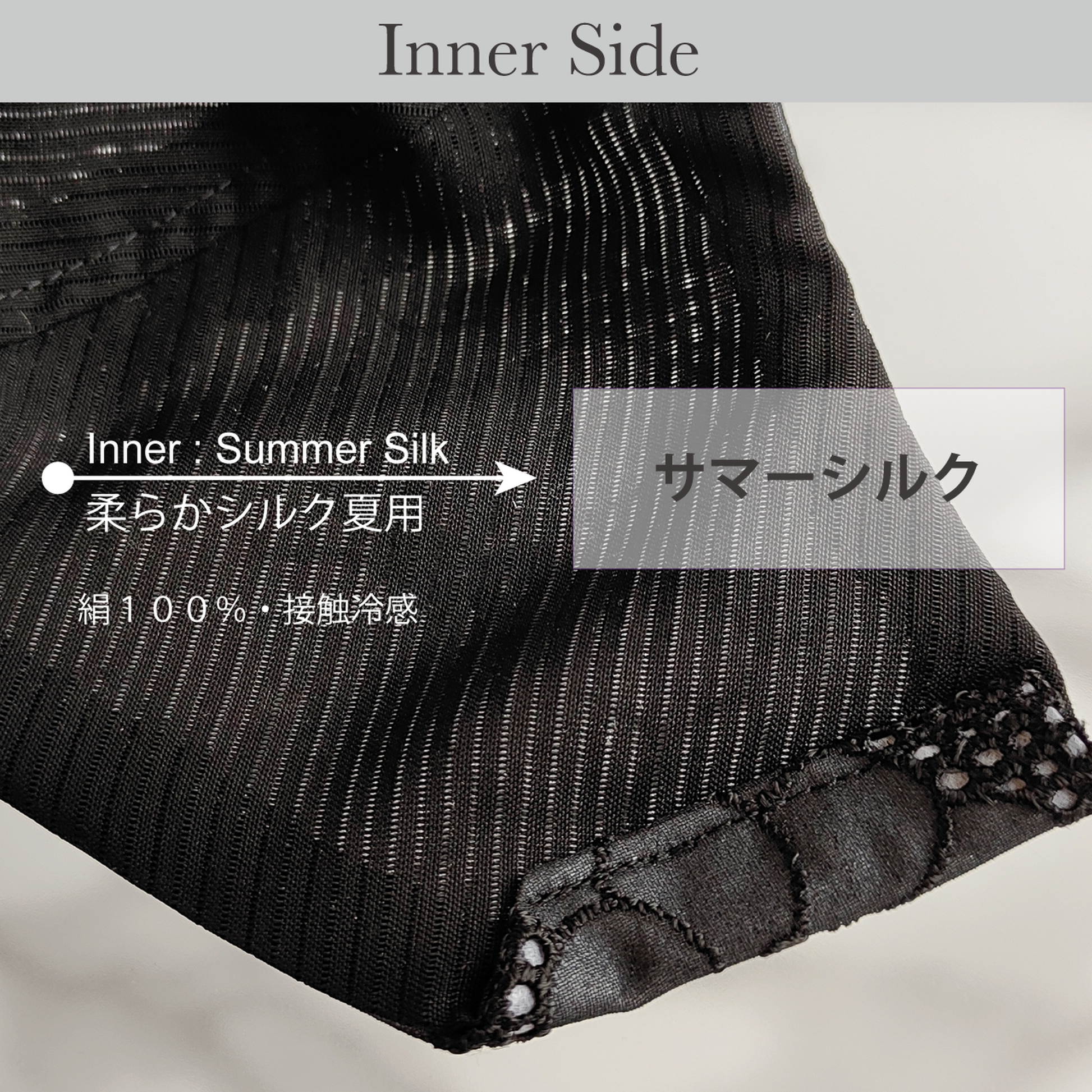 天然シルクは人の肌と同じタンパク質由来で、長時間の着用でも優しい肌触り。