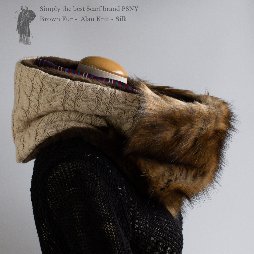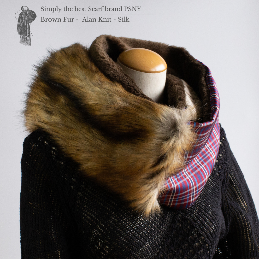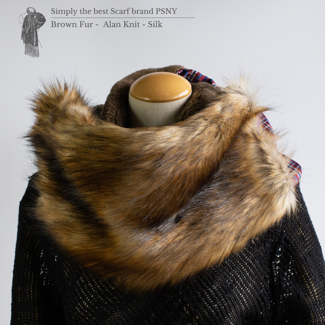 雙面圍裹式圍脖,將長絨毛棕色生態毛皮與柔軟的針織面料相結合。