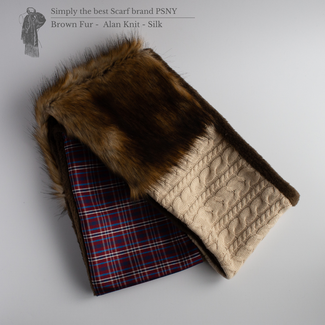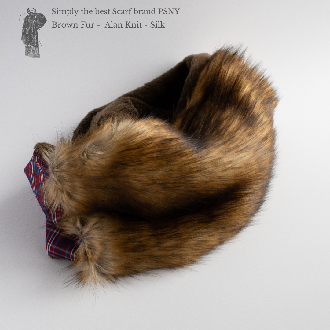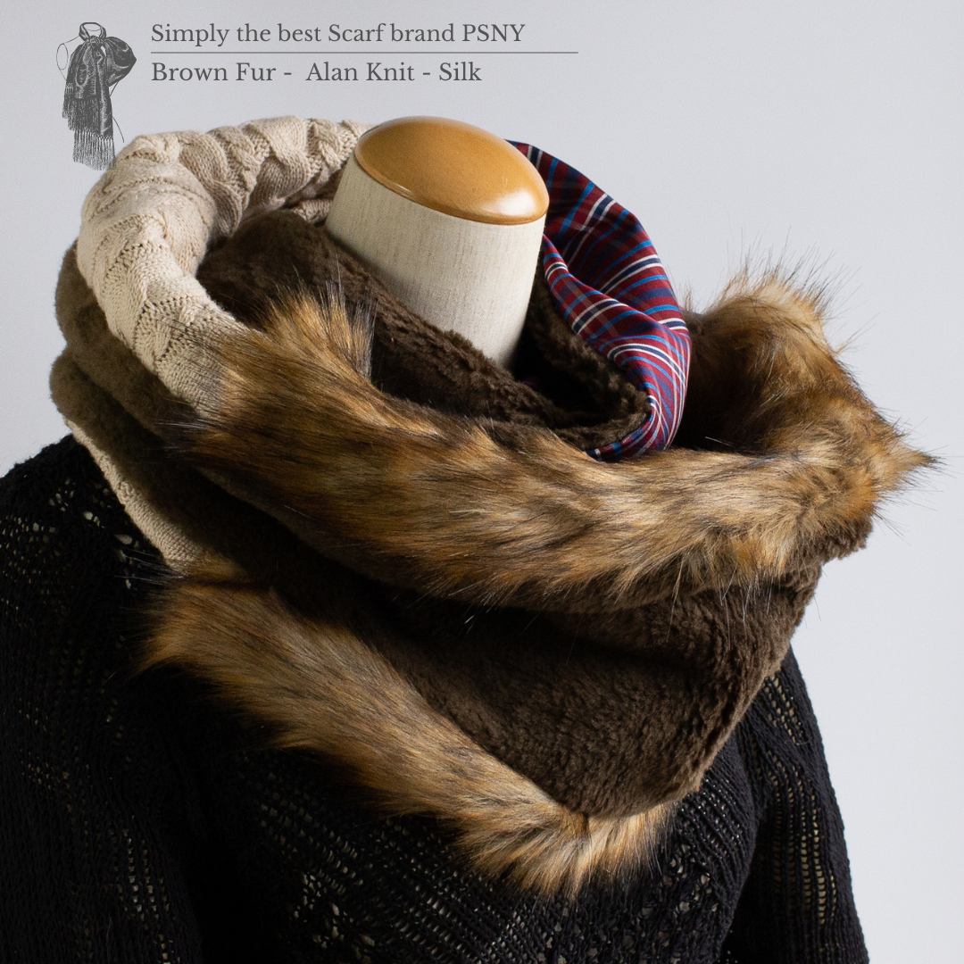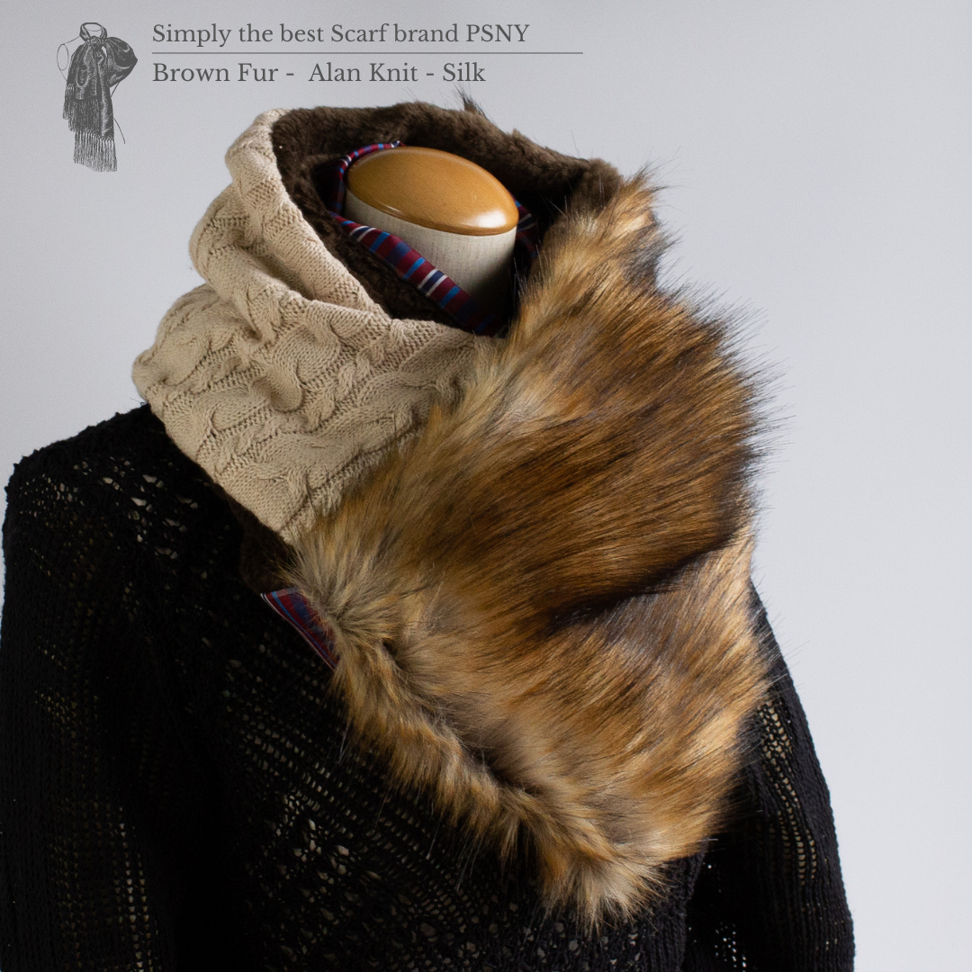 雙面圍裹式圍脖,將長絨毛棕色生態毛皮與柔軟的針織面料相結合。