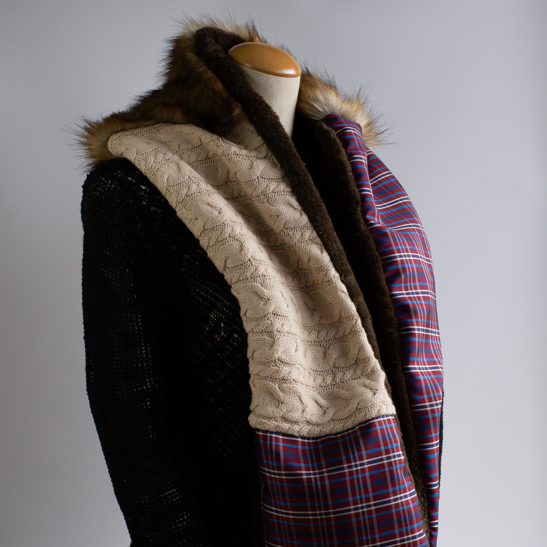 A面:Nuance棕色生態皮草、米色阿蘭圖案針織、方格真絲(酒紅色)