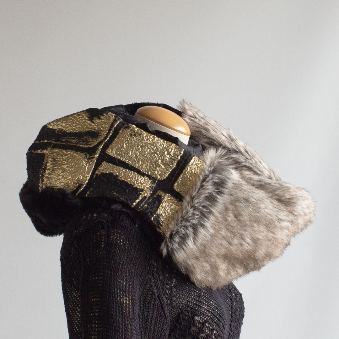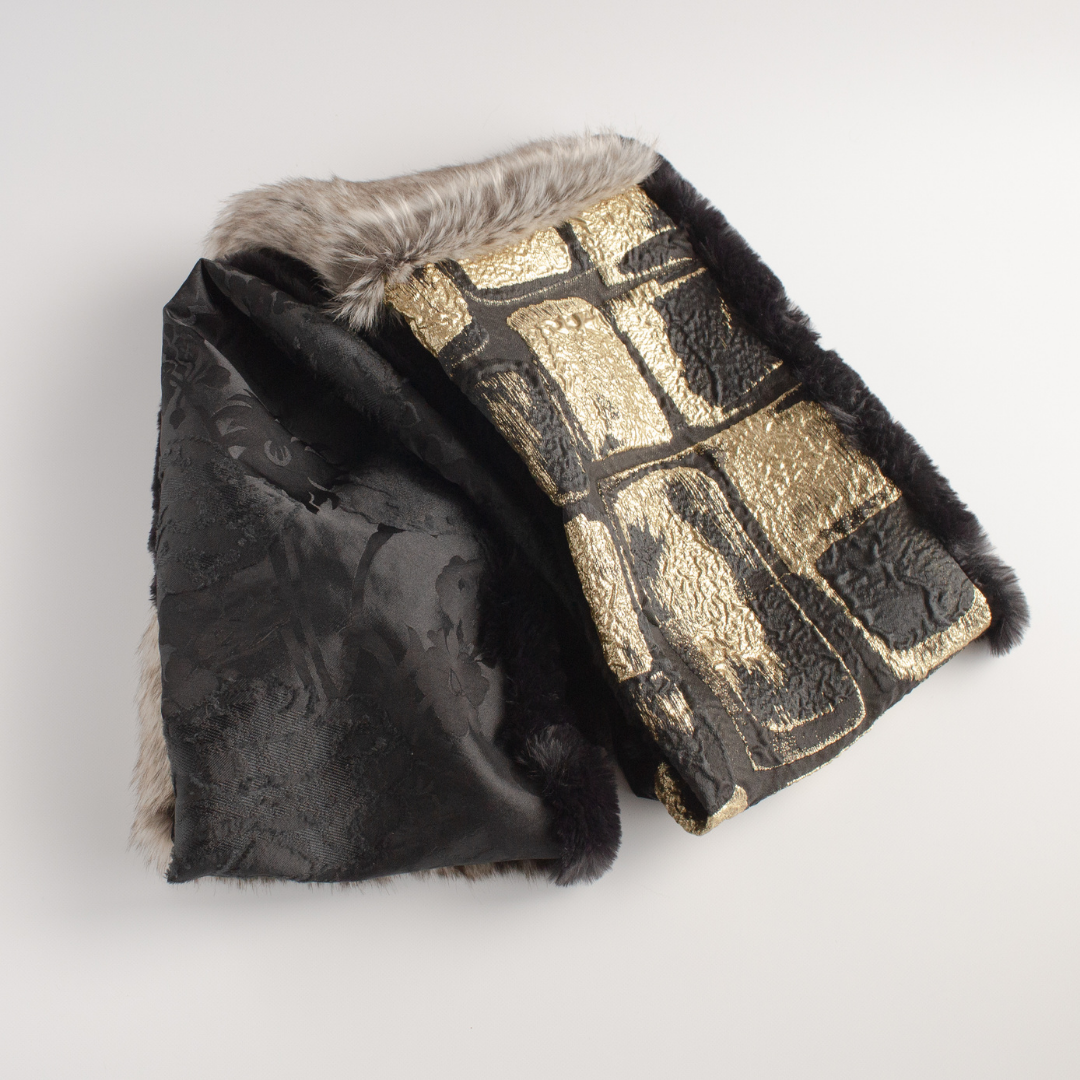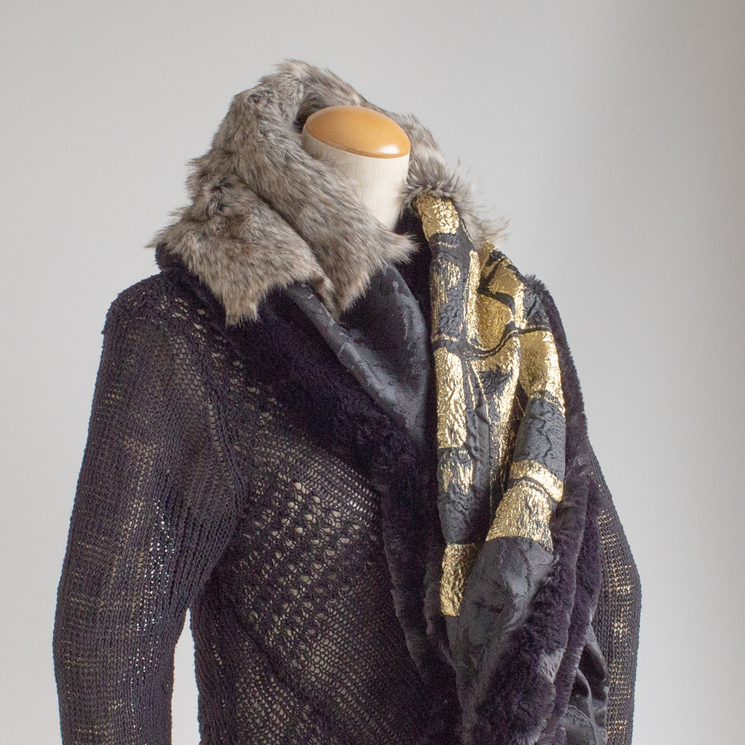 雙面圍裹式圍脖,長絨灰色生態毛皮和 Larjan 壓花(意大利絲綢混紡)給人以華麗印象。