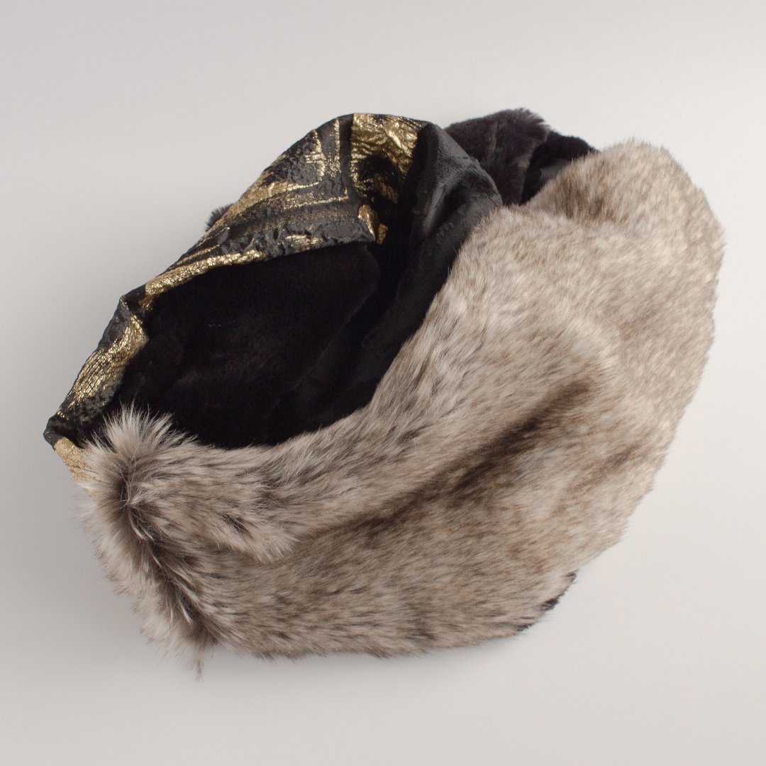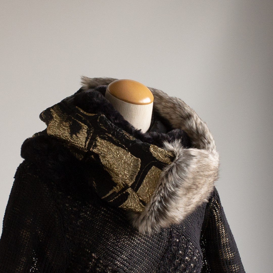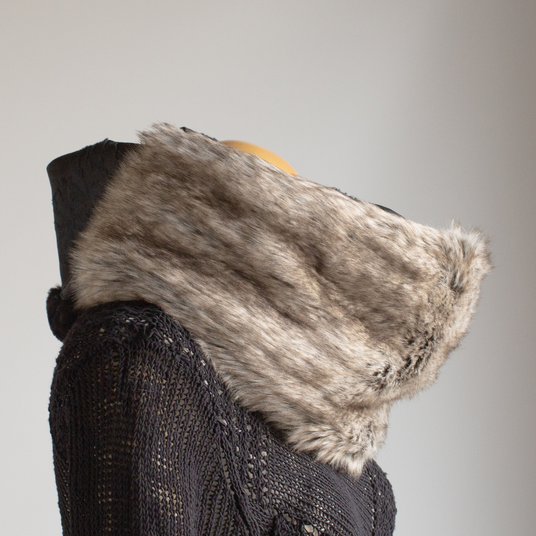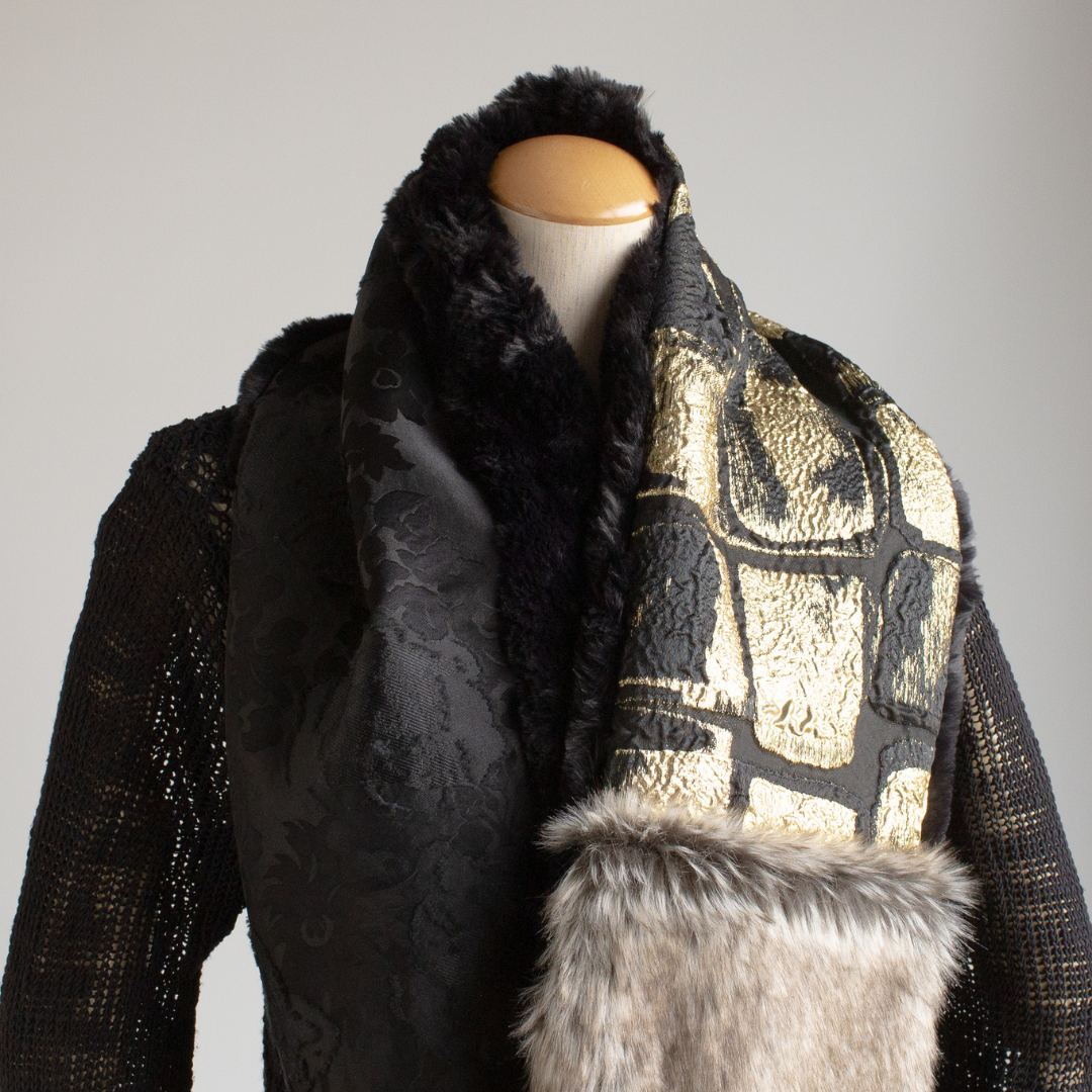 雙面圍裹式圍脖,長絨灰色生態毛皮和 Larjan 壓花(意大利絲綢混紡)給人以華麗印象。