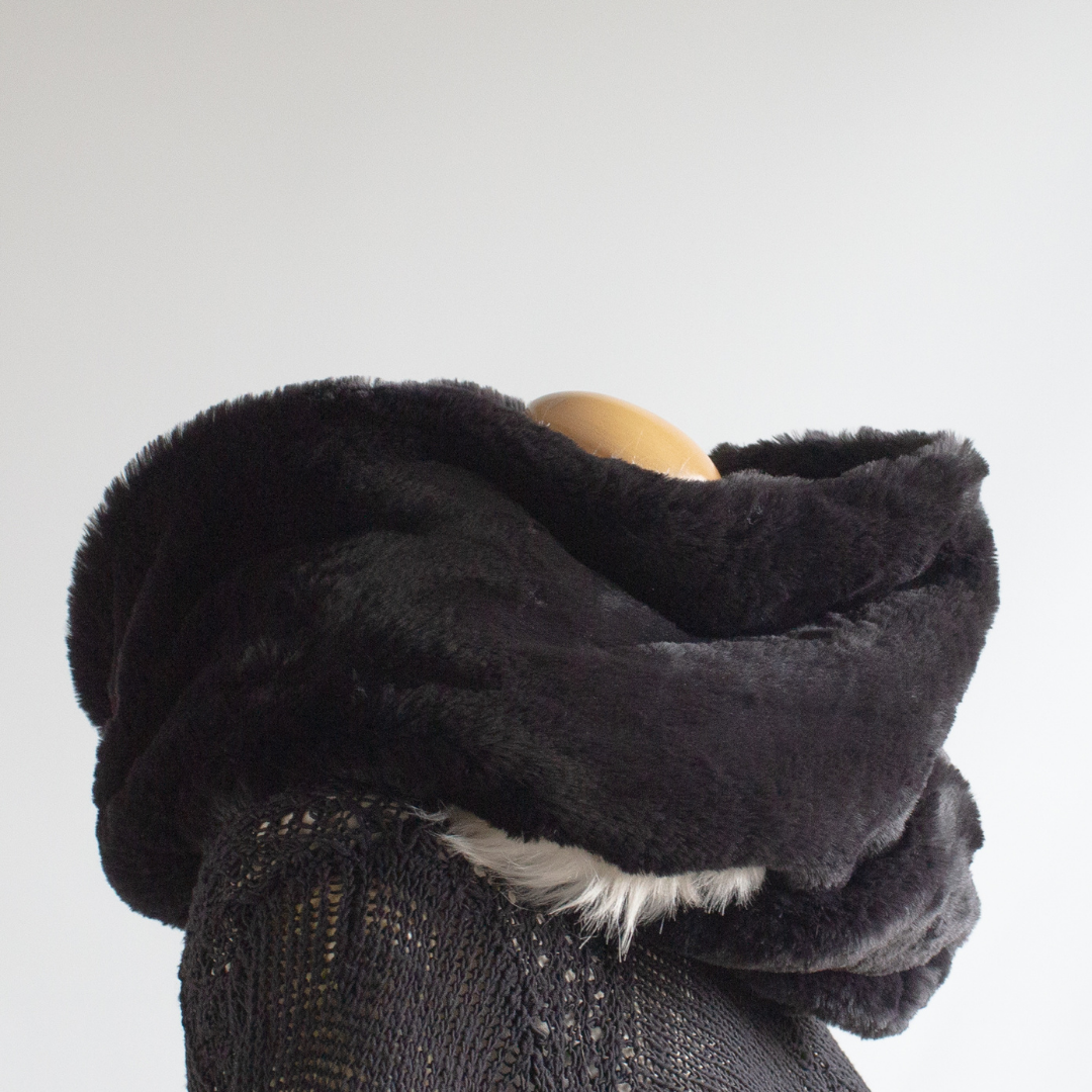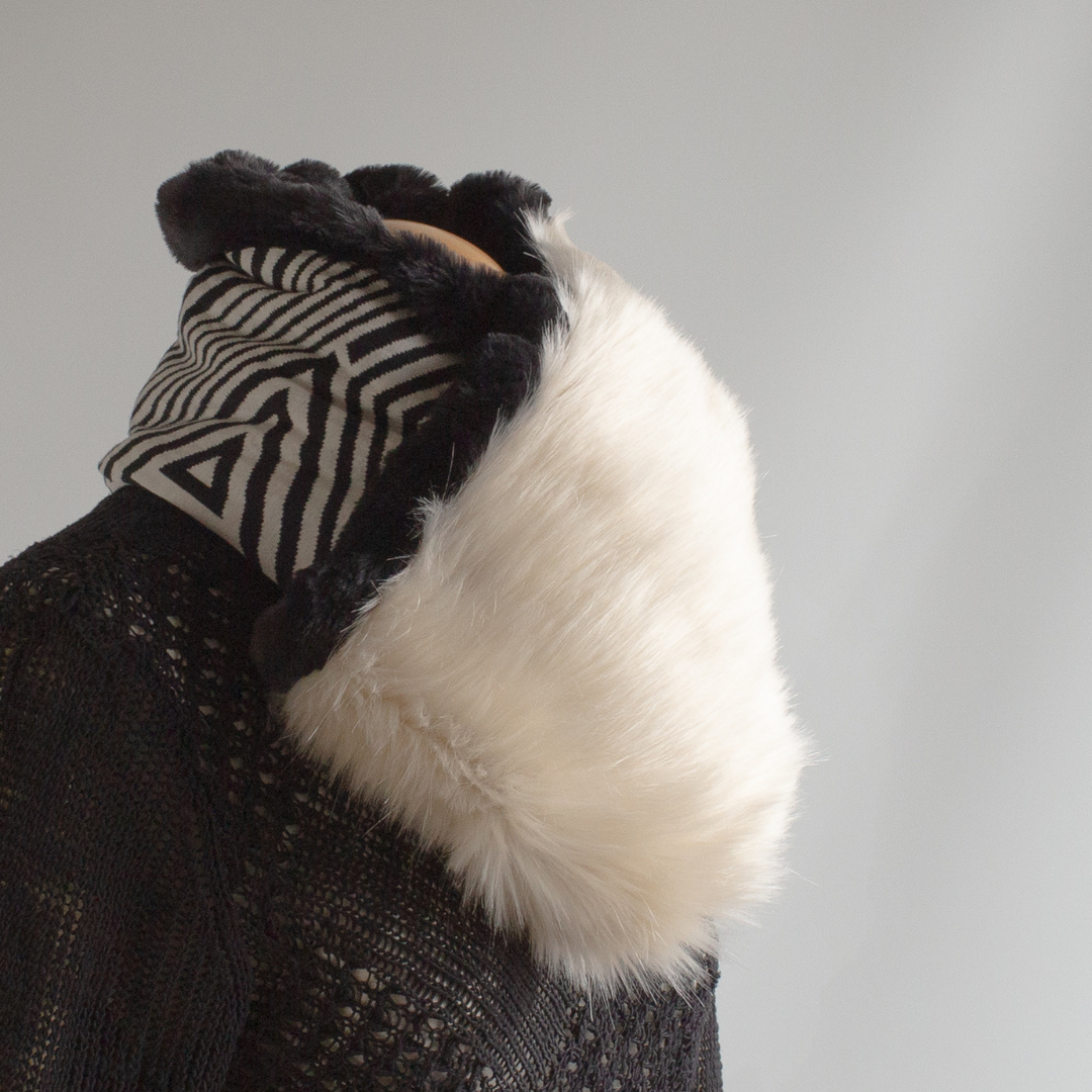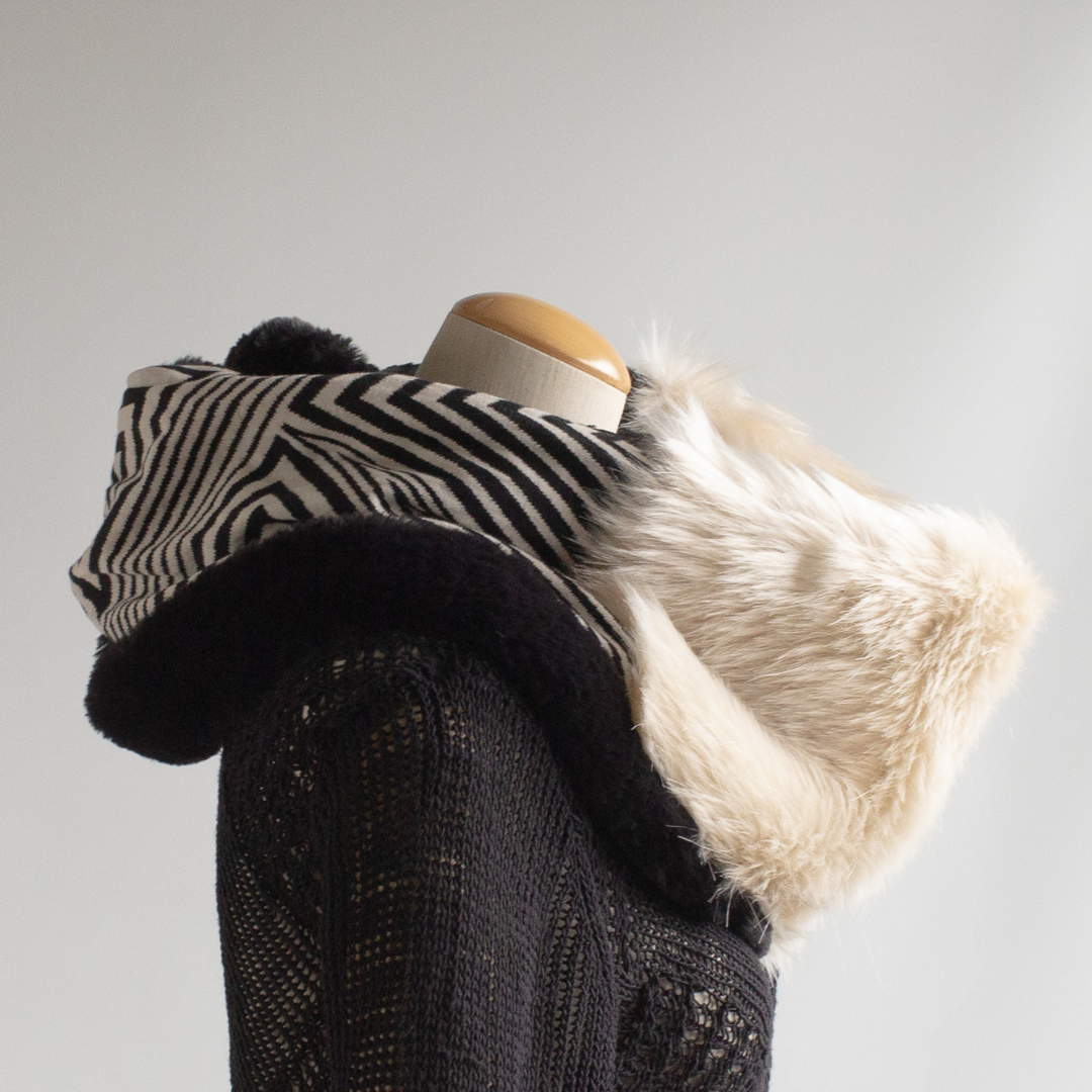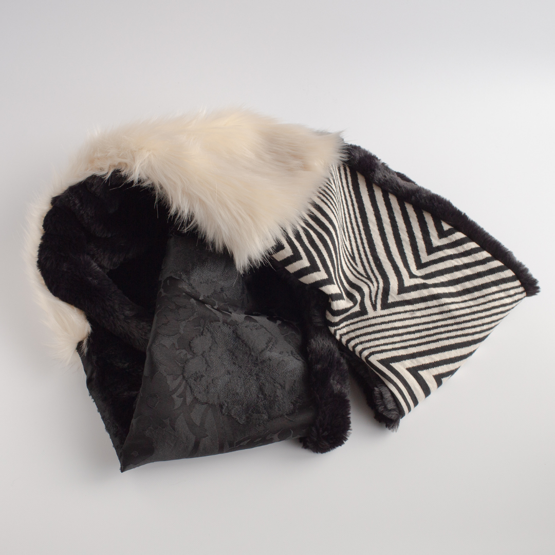 雙面環繞式圍脖,結合長絨毛白色和黑色生態毛皮。