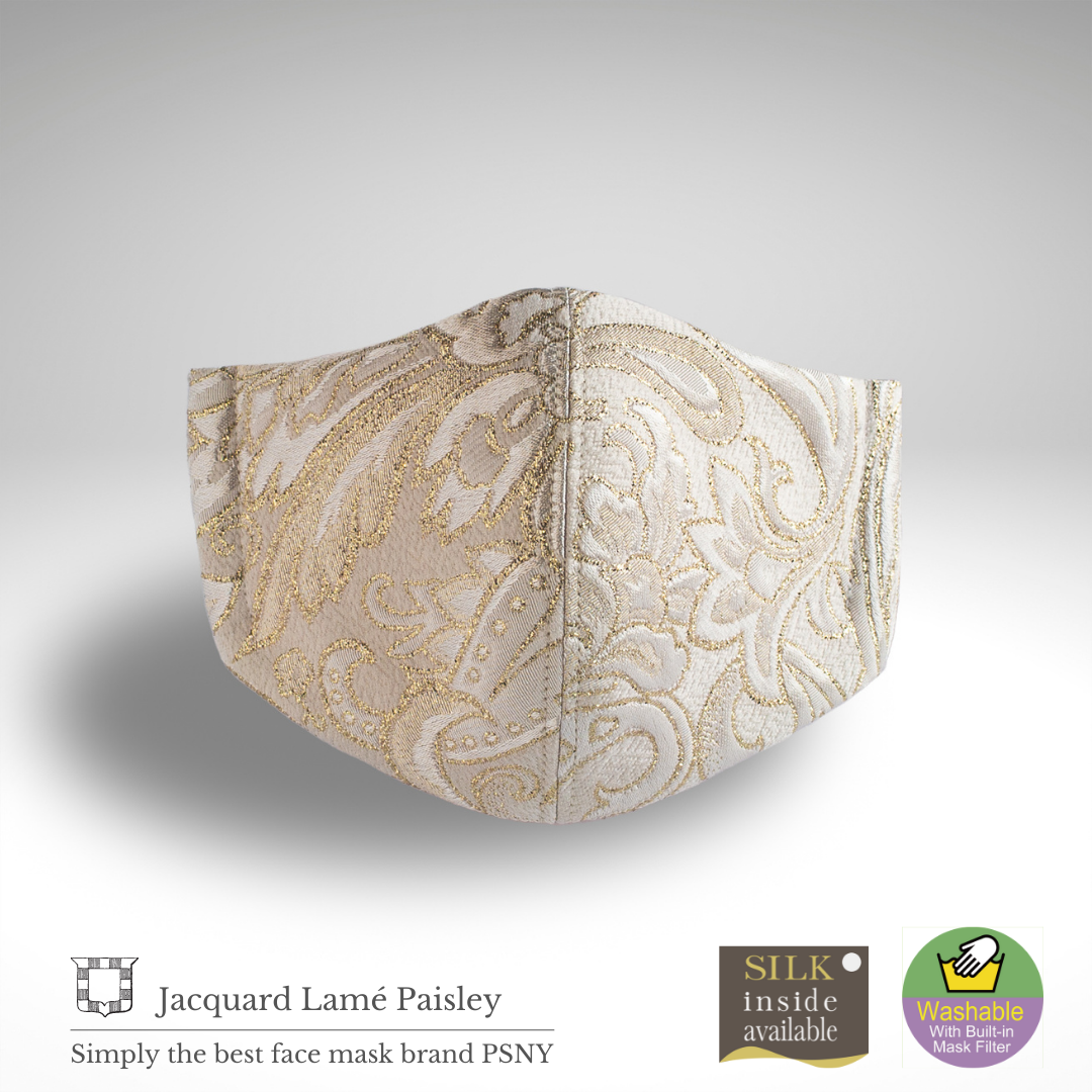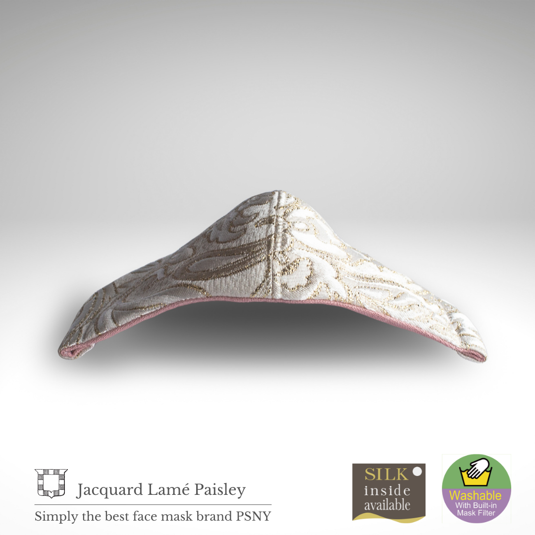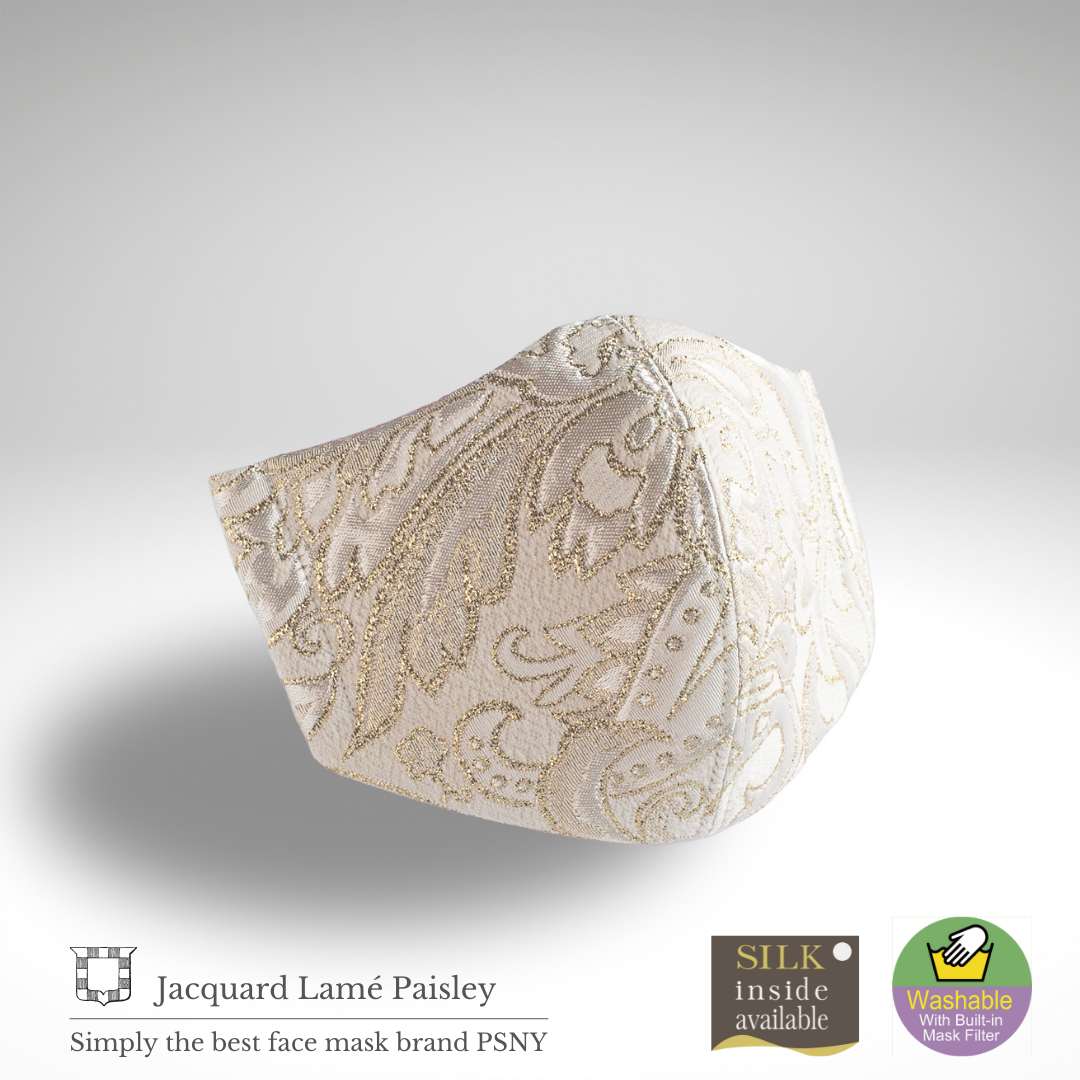 這是一款高度完整的面具,帶有漂亮的佩斯利圖案,在優雅的象牙色底座上結合了銀色刺繡和金色閃光。