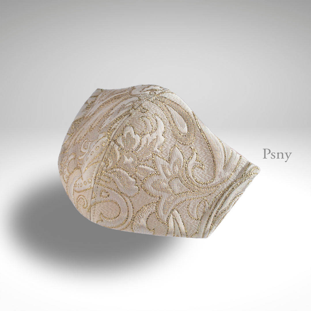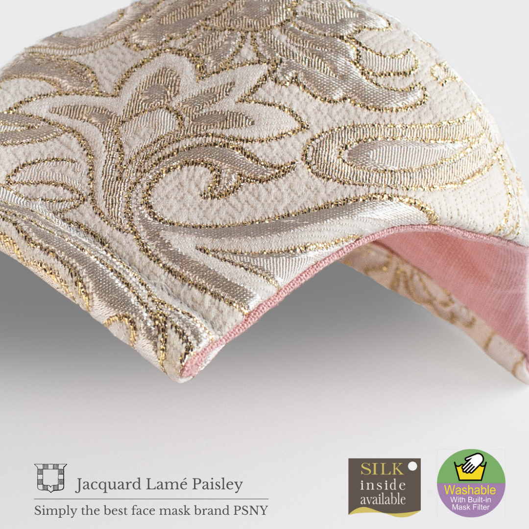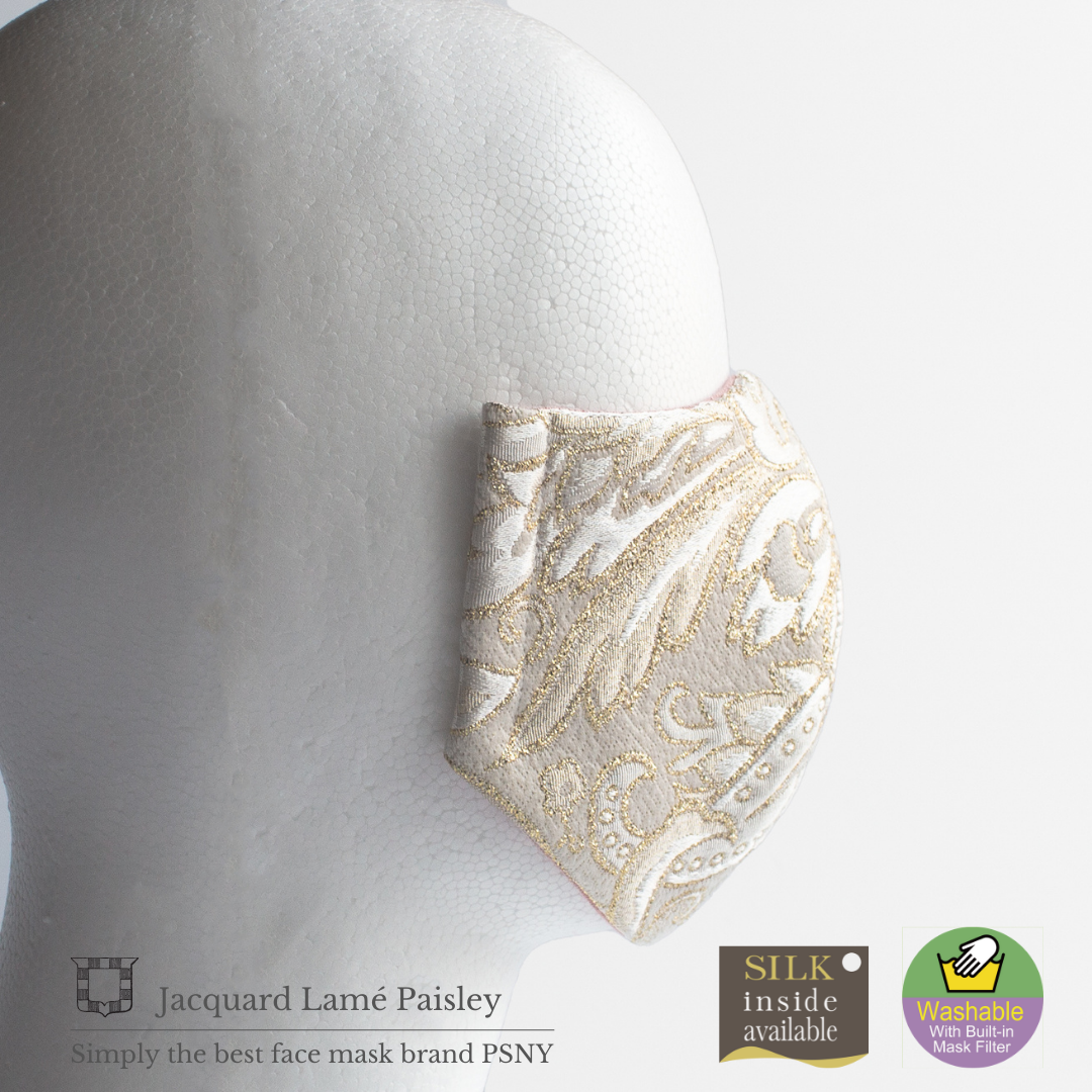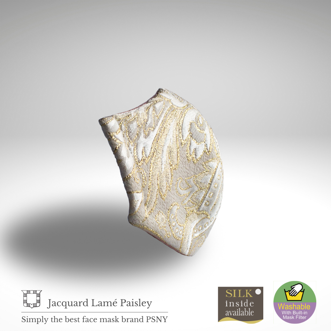 這是一款高度完整的面具,帶有漂亮的佩斯利圖案,在優雅的象牙色底座上結合了銀色刺繡和金色閃光。