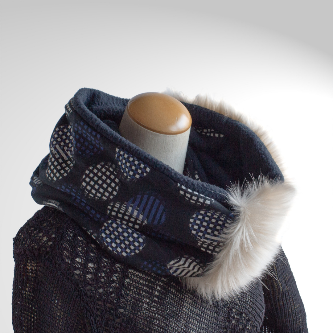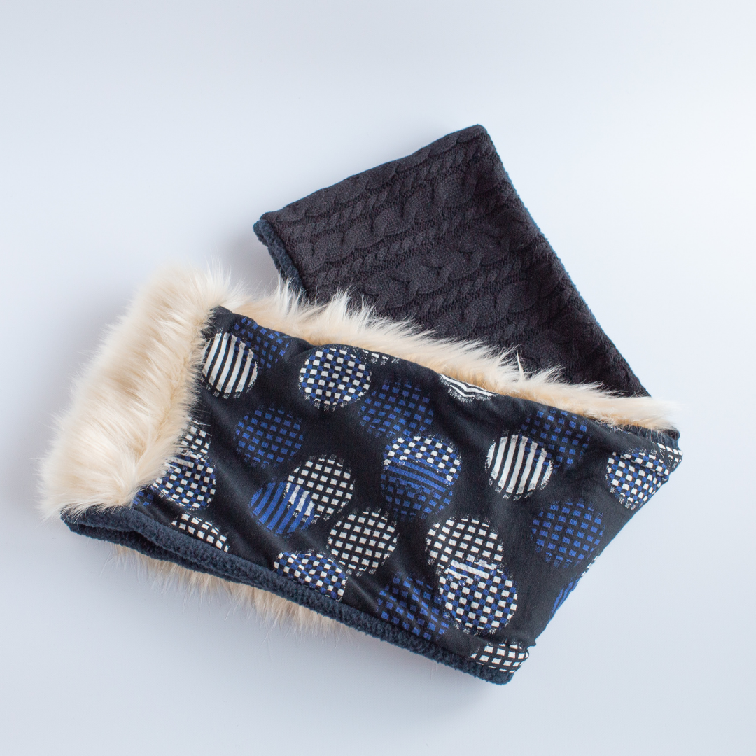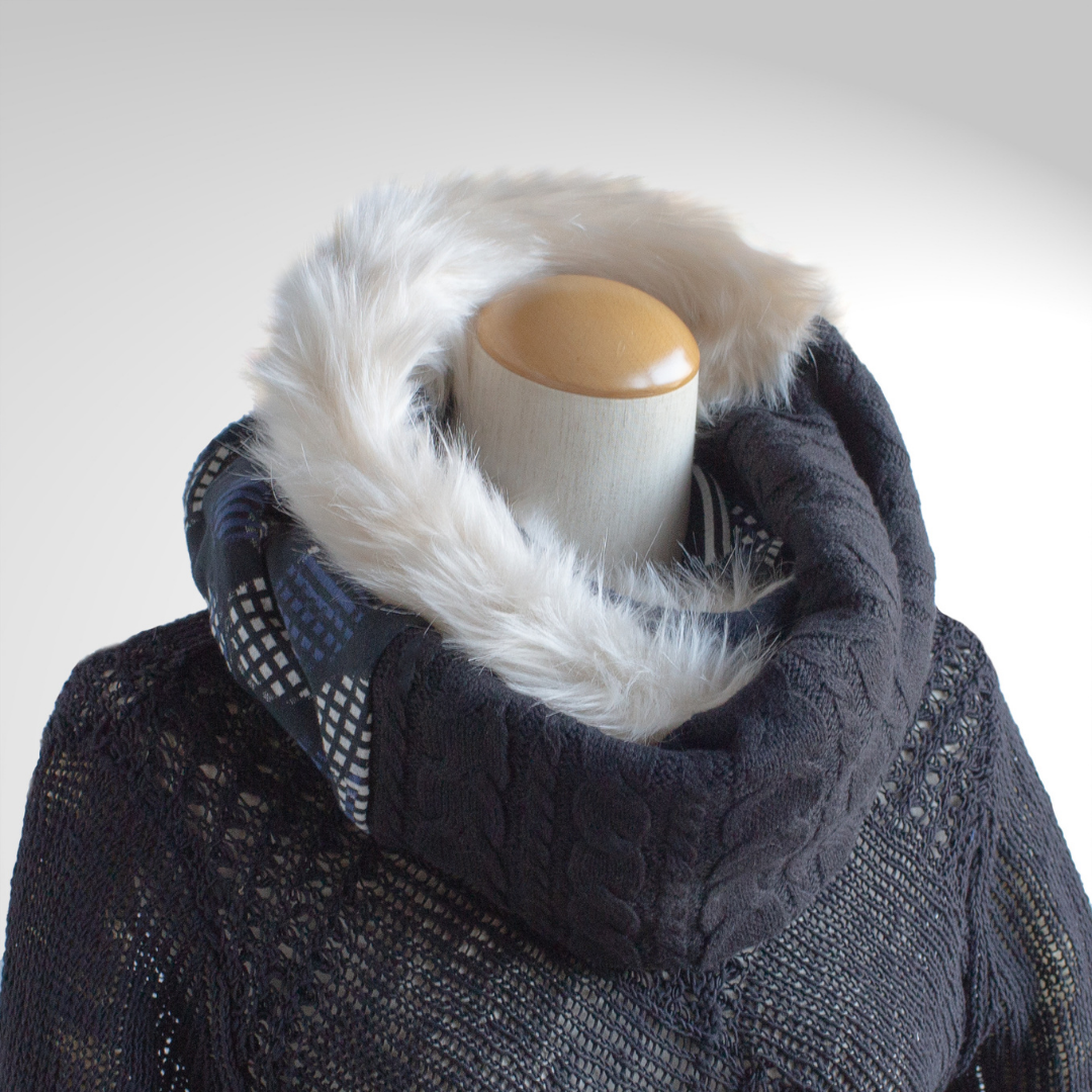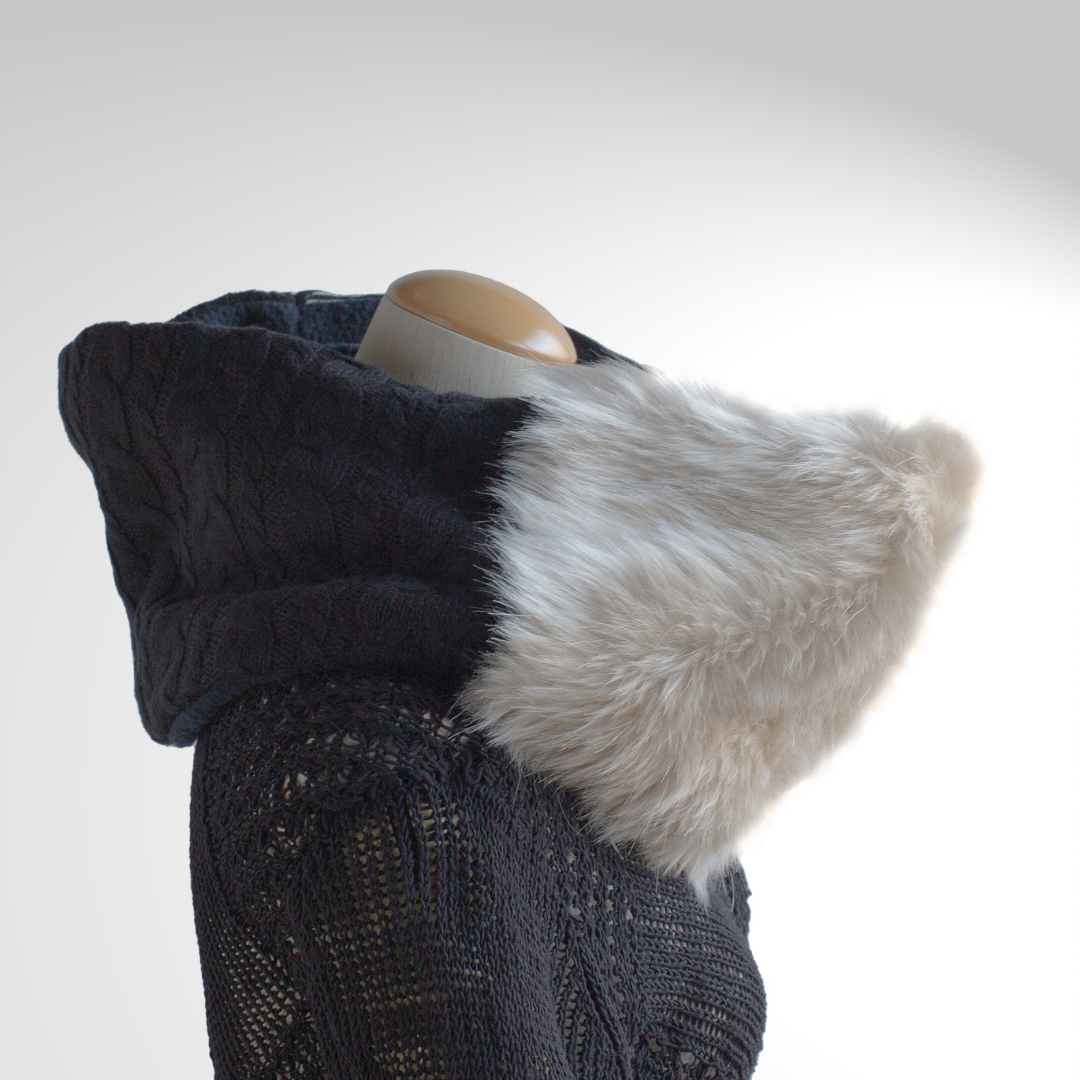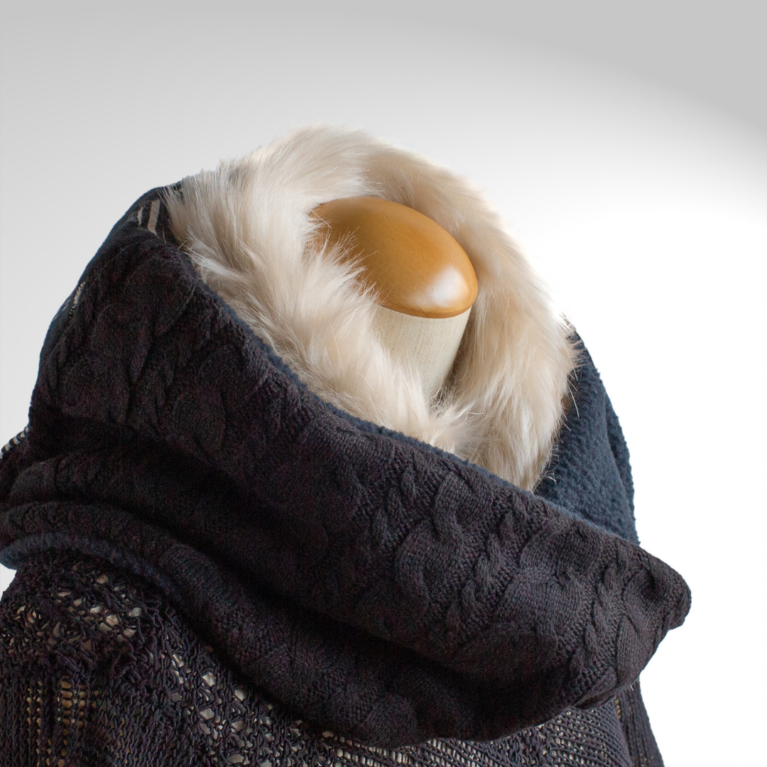 這是一款以長毛絨白色生態毛皮為中心結合了亞蘭圖案和圓點針織的圍脖。 B 面是雙面環繞式圍脖,帶有易於使用的深藍色圍巾。
