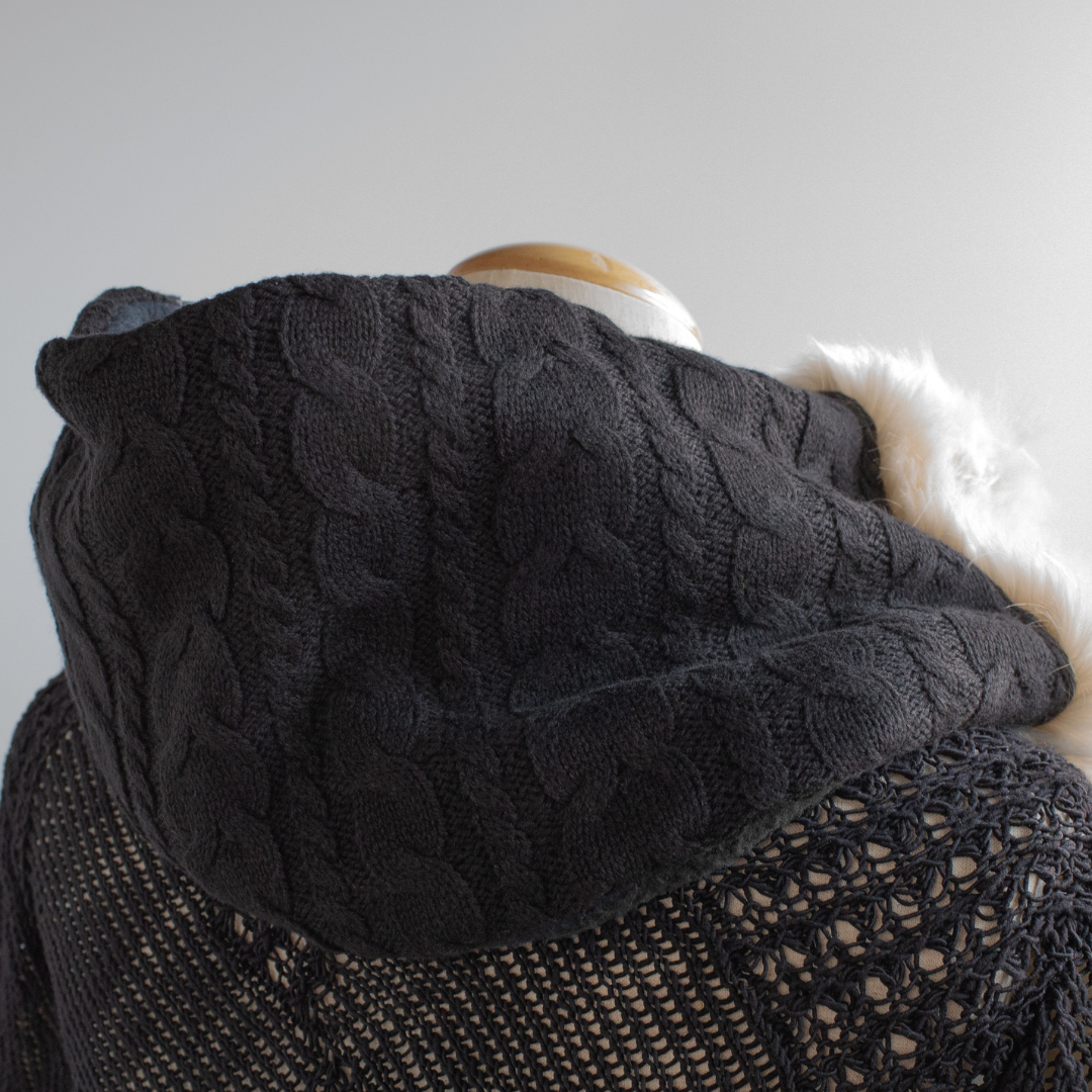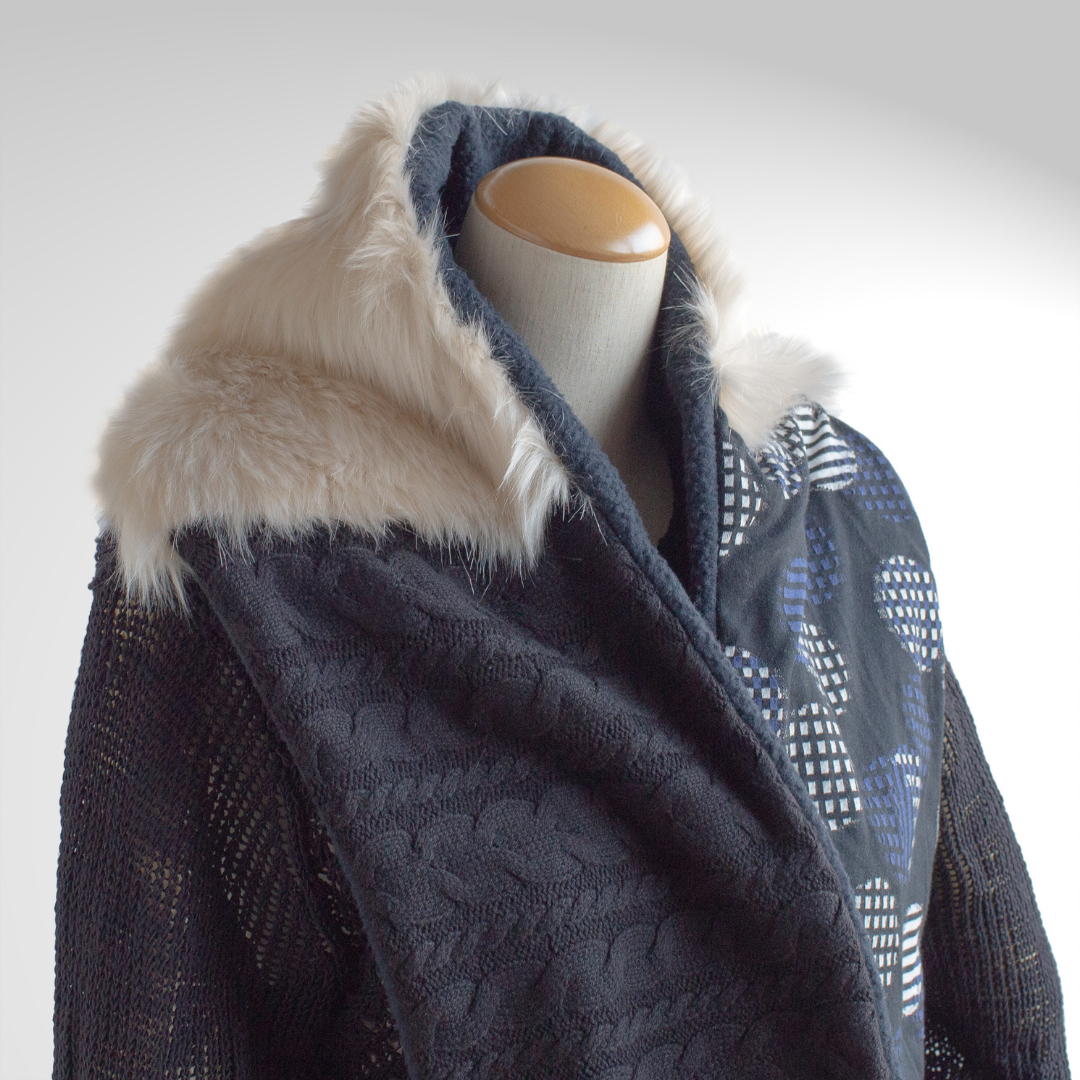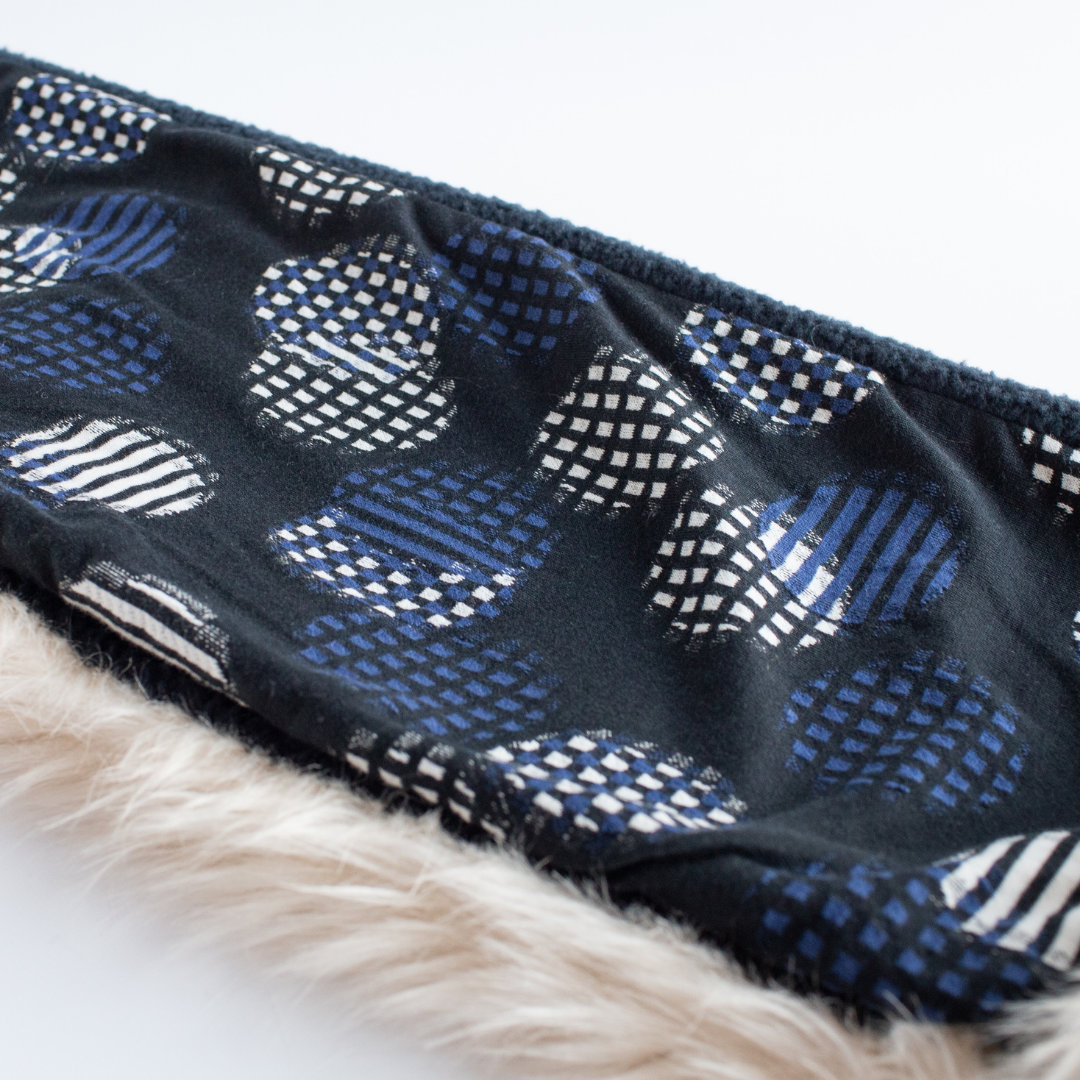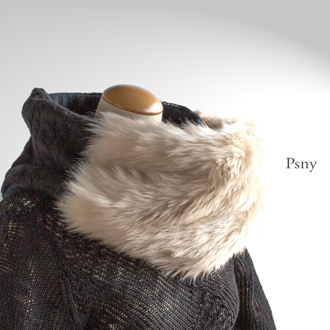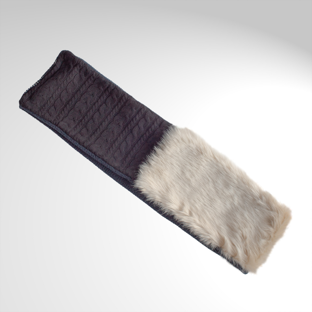 這是一款以長毛絨白色生態毛皮為中心結合了亞蘭圖案和圓點針織的圍脖。 B 面是雙面環繞式圍脖,帶有易於使用的深藍色圍巾。
