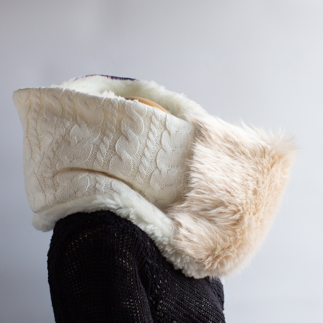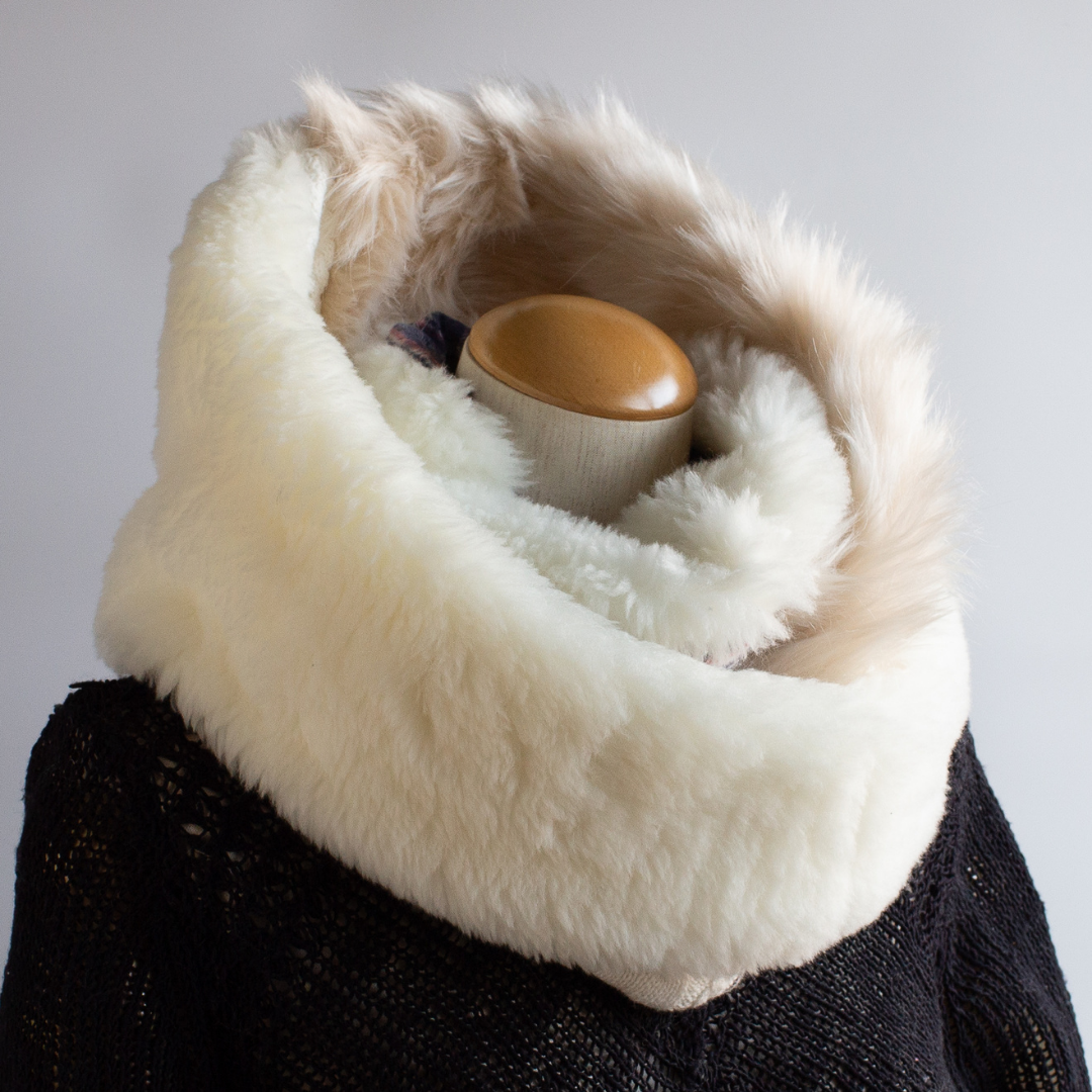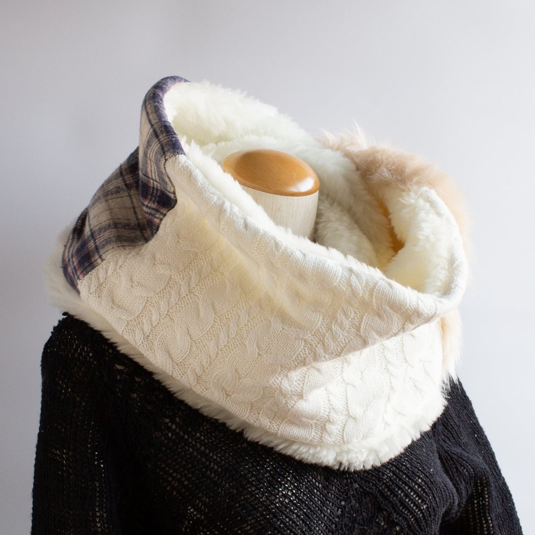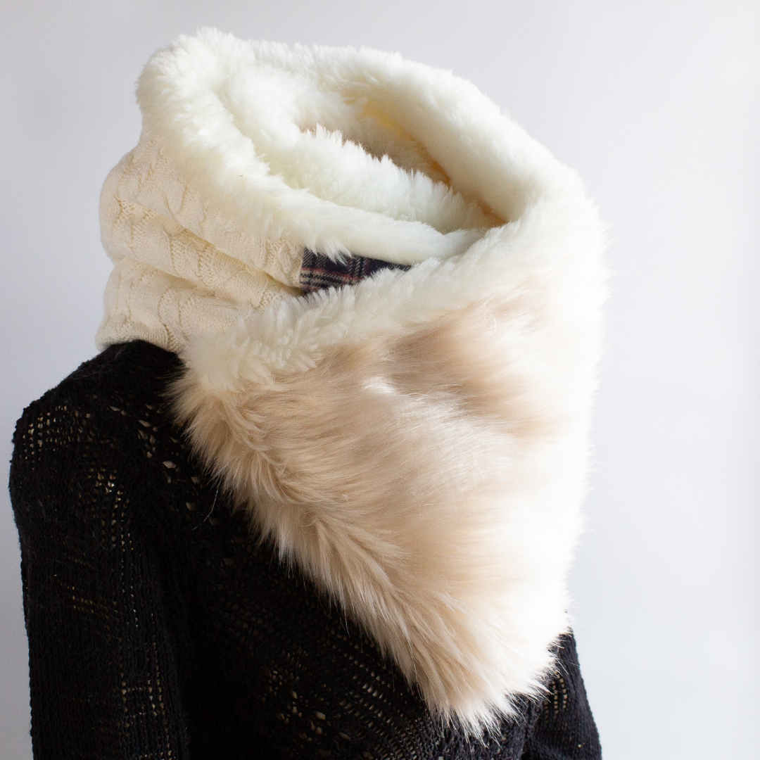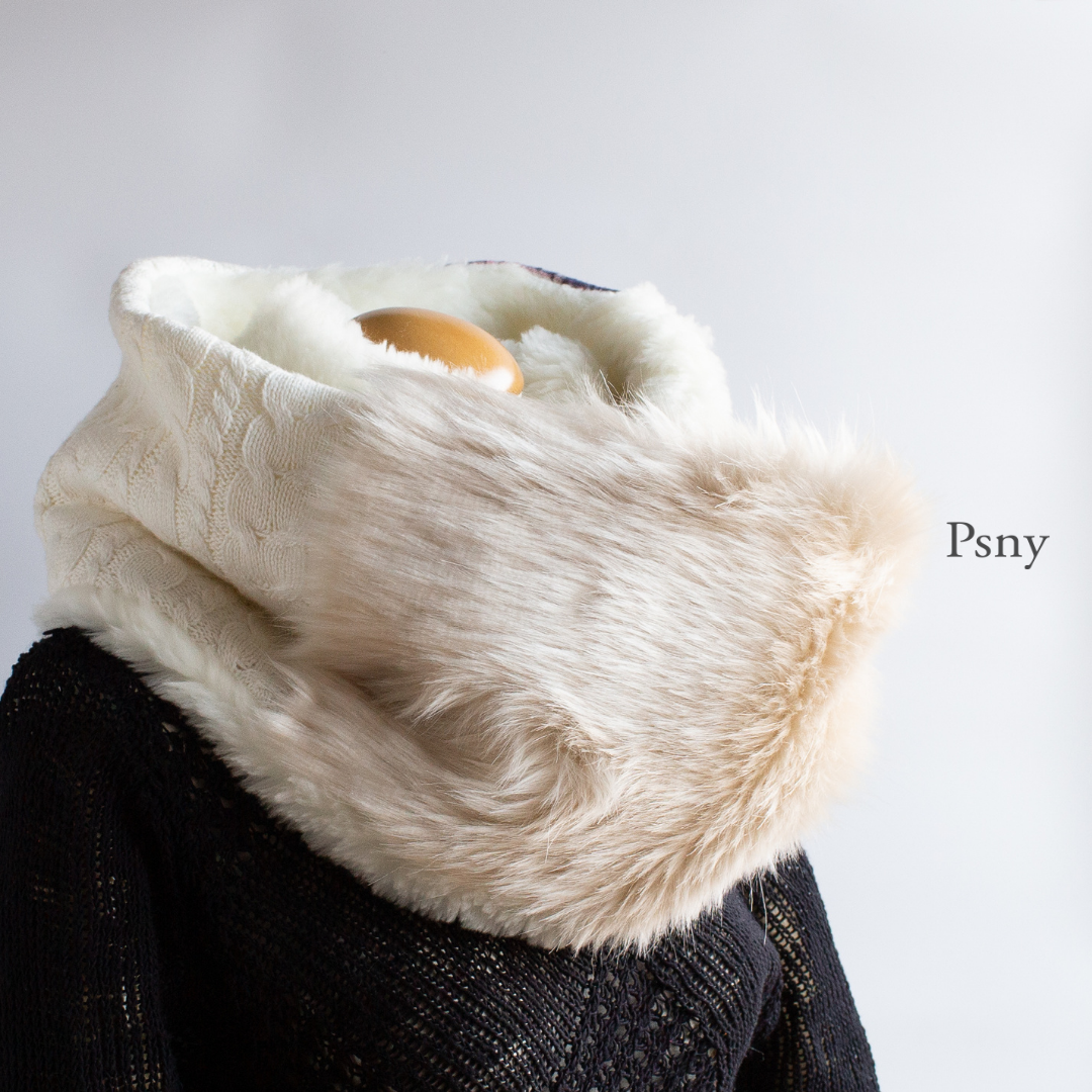 這是一款結合了白色 Aran 圖案和格紋針織的圍脖,主要採用長毛絨白色生態毛皮。 B 面是由短絨白色生態毛皮製成的雙面環繞式圍脖。