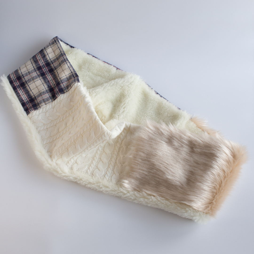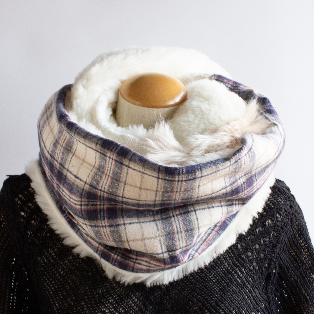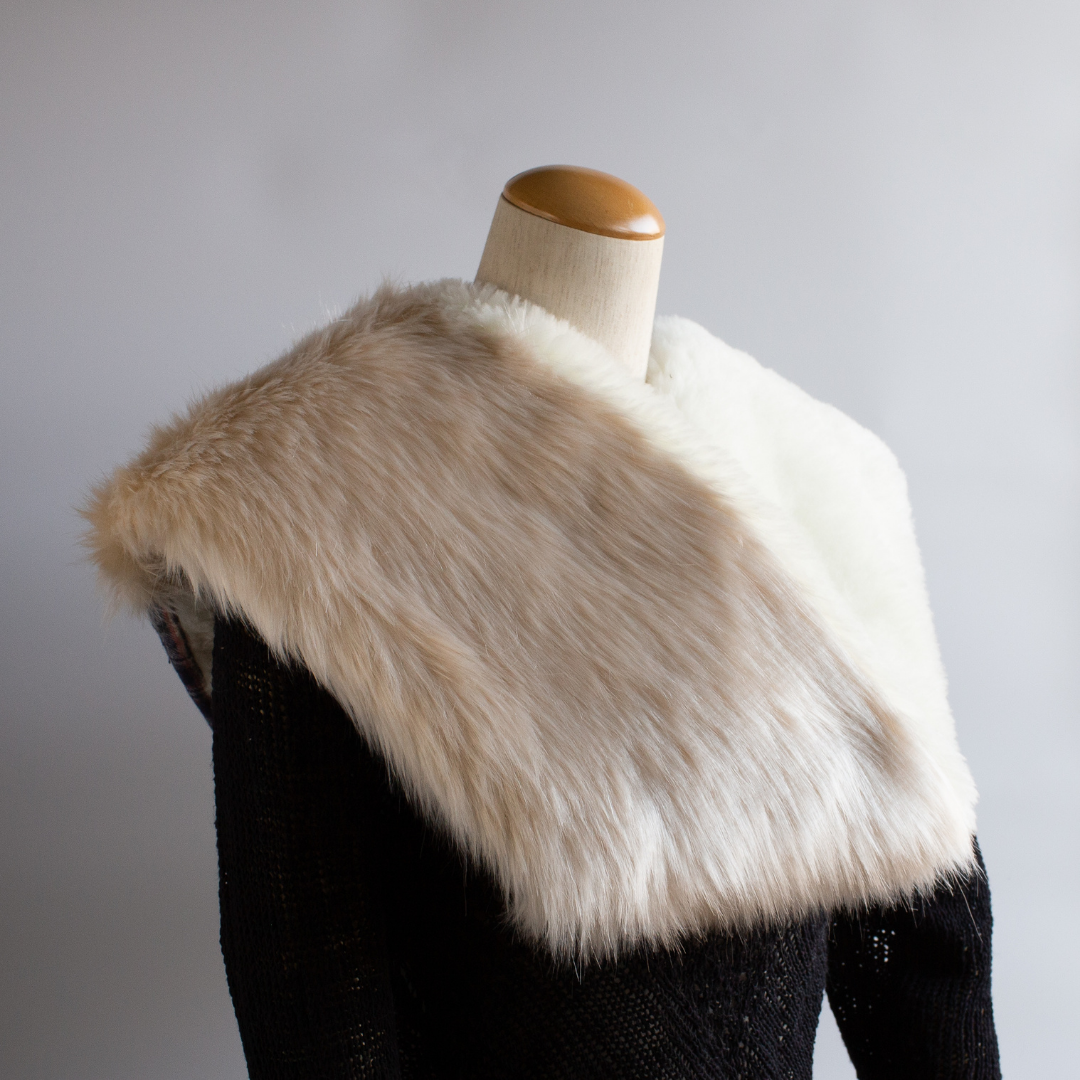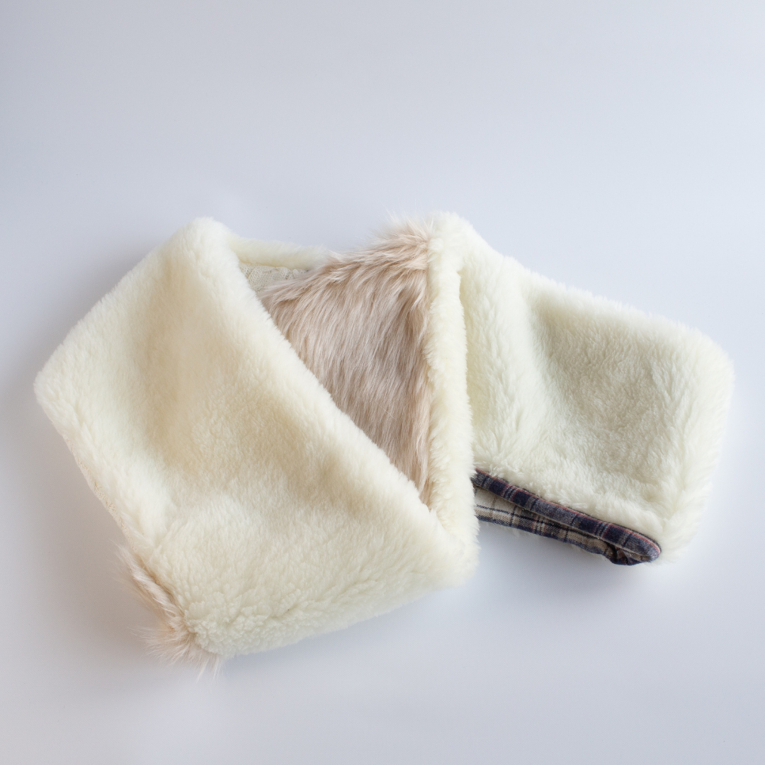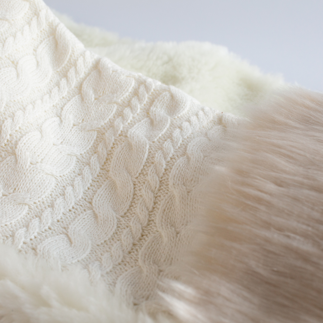 這是一款結合了白色 Aran 圖案和格紋針織的圍脖,主要採用長毛絨白色生態毛皮。 B 面是由短絨白色生態毛皮製成的雙面環繞式圍脖。