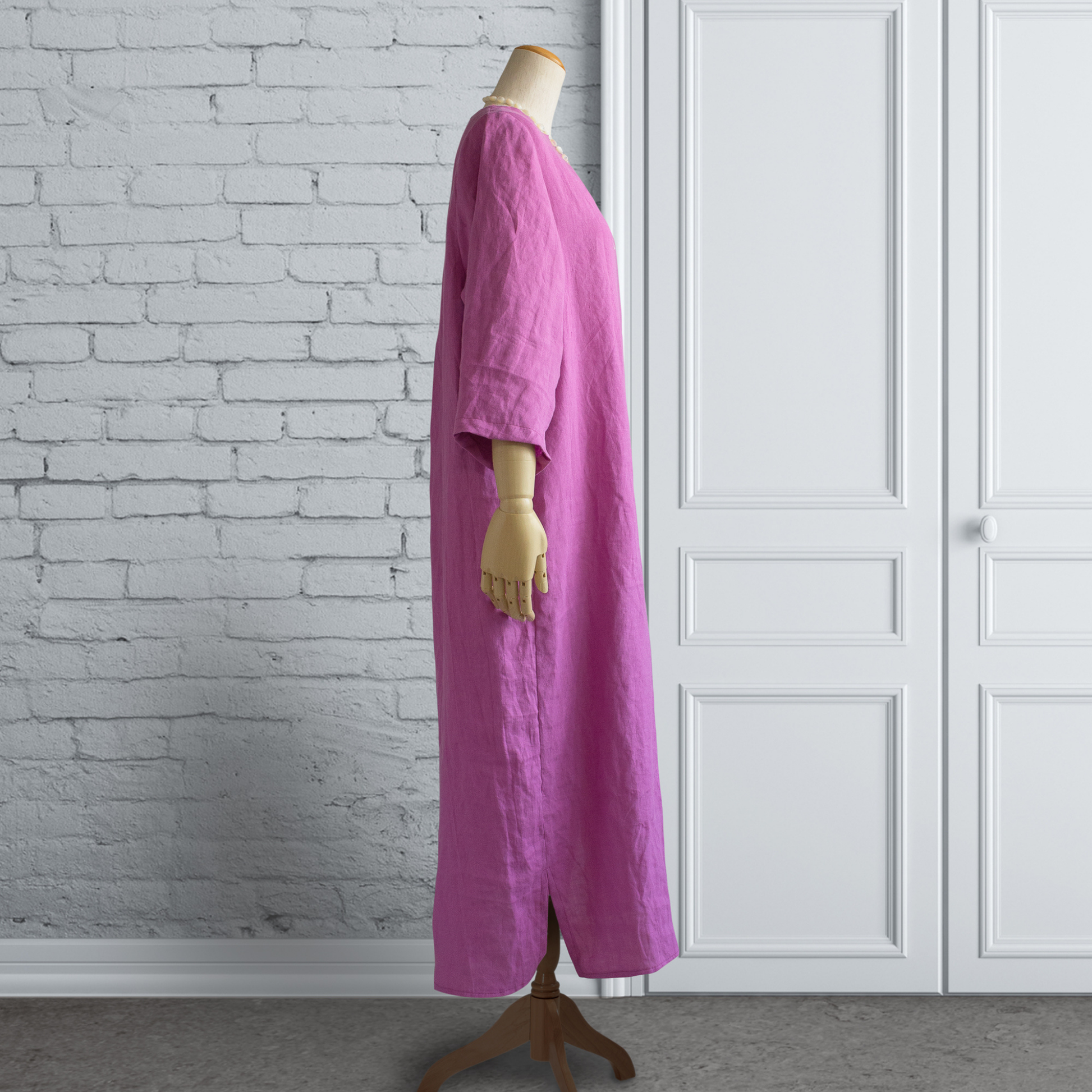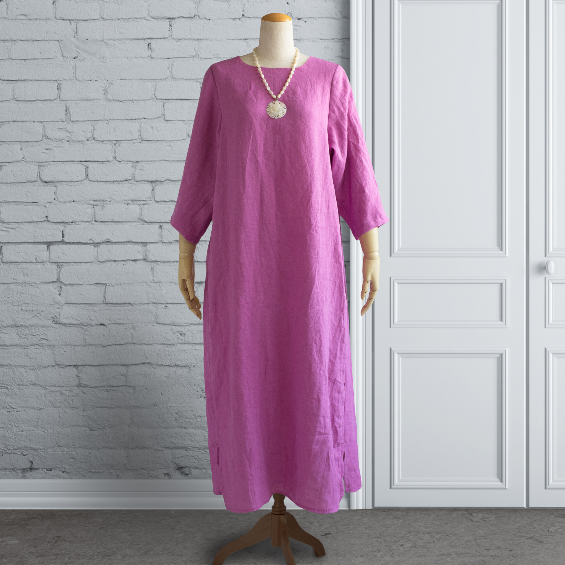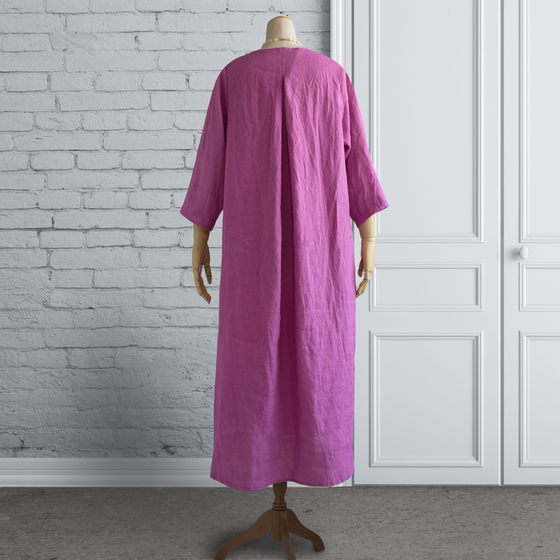 比利時亞麻 背部打褶 A 字洋裝|紫色(七分袖)